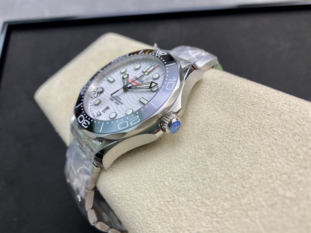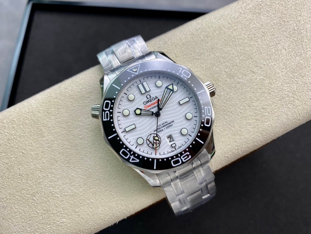 Omega Seamaster Diver 300M Co-Axial Master Chronometer 42mm White Dial. It is a 1:1 superclone watch. which means that it is made with the same materials and to the same specifications as the genuine watch. The only difference is that the movement is a cloned movement instead of the genuine Omega Master Chronometer movement.