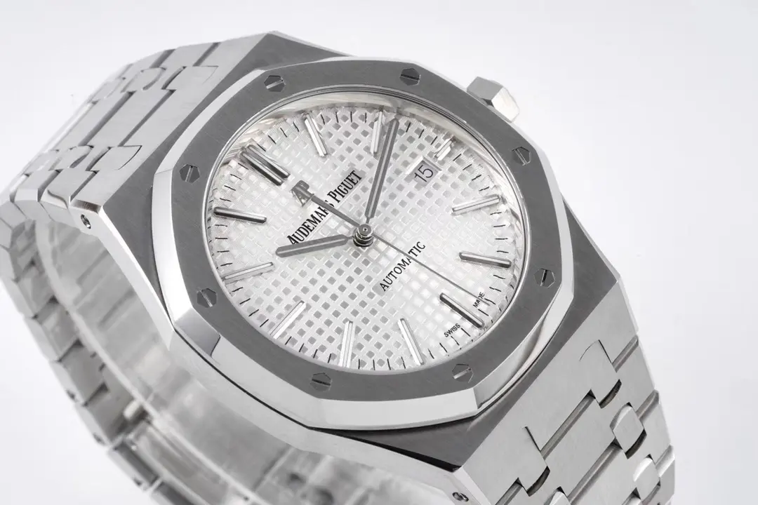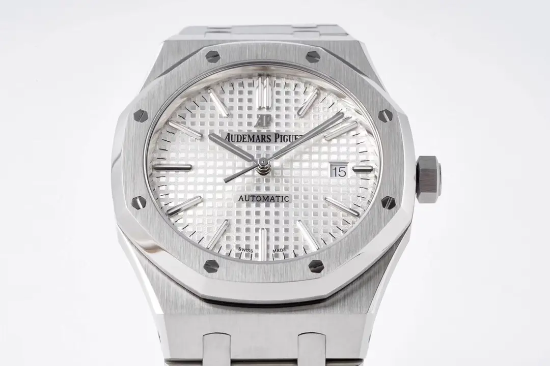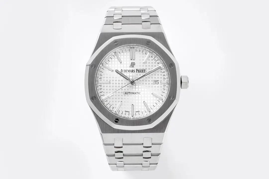 Audemars Piguet Royal Oak 15400 Silver Automatic — Premium 1:1 super clone. Case: 904L stainless steel case and integrated bracelet. Crystal: Genuine sapphire crystal with AR coating. Movement: Clone AP Cal. 3120 (21,600 bph, 60hr power reserve, date). 12-month movement warranty. Free worldwide shipping on orders over $1,200.