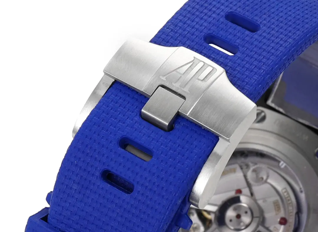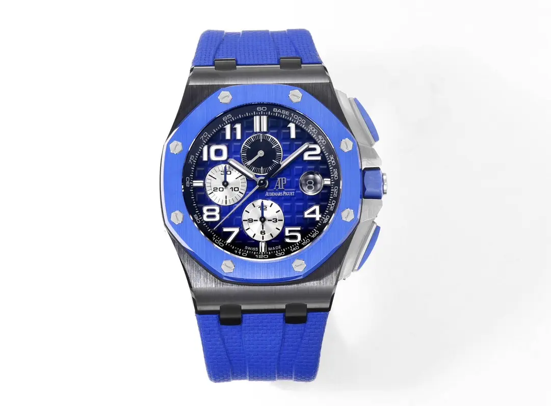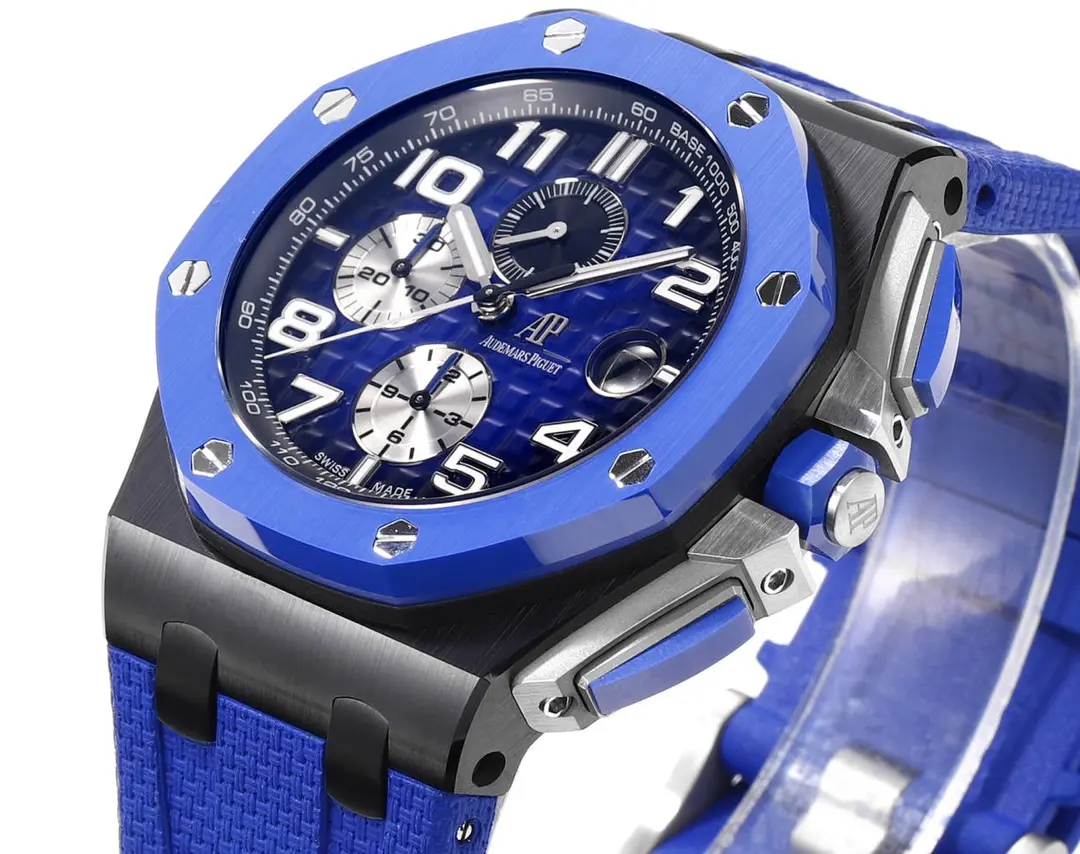 Audemars Piguet Royal Oak Offshore Blue Chronograph — Premium 1:1 super clone. Case: 904L stainless steel case and integrated bracelet. Crystal: Genuine sapphire crystal with AR coating. Movement: Clone AP Cal. 2385 (column-wheel flyback chronograph). 12-month movement warranty. Free worldwide shipping on orders over $1,200.