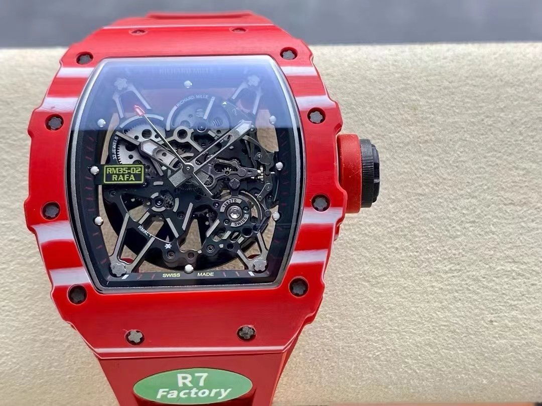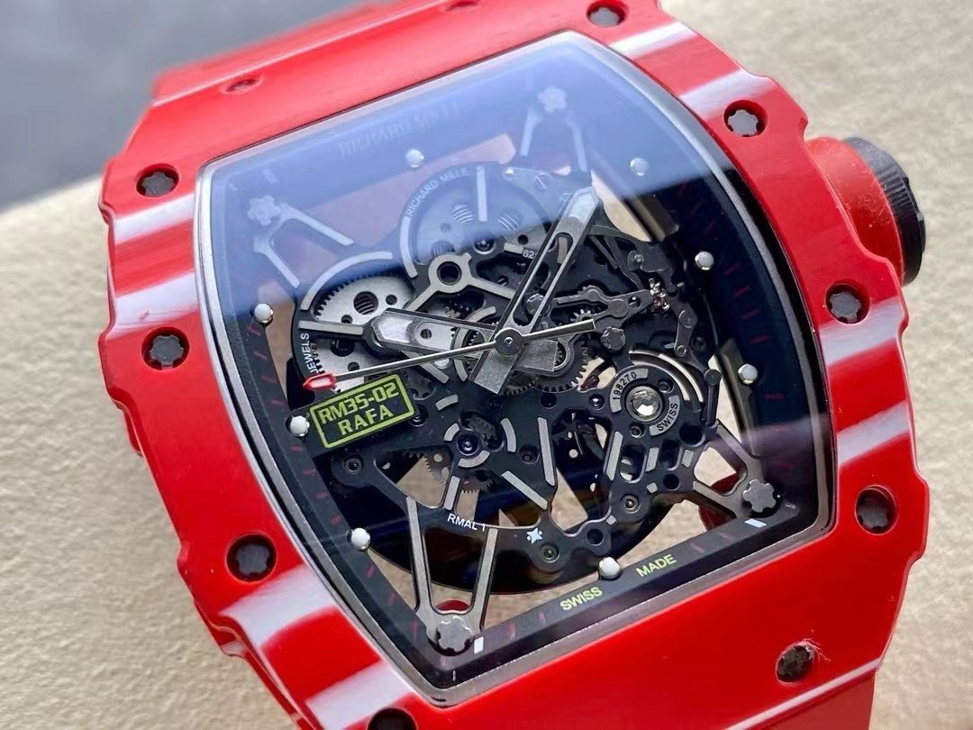 The Richard Mille RM35-02 is an audacious and sporty timepiece, a convergence of innovative materials and design. In a 42mm x 50mm case, there is an elegantly curved tonneau-shaped dial exuding pure sophistication. The bezel, crown, and back of this watch are made from real NTPT red carbon fiber, giving it a glossy look with texture patterns exclusive to each piece—far beyond the ordinary PVD coatings or metals. The carbon fiber case and red rubber strap add to its modern, sporty appeal. Powered by a Swiss movement, this sports watch features skeletonized design through a see-through case back, exhibiting the fascinating Swiss handiwork. The RM35-02 also features a sapphire crystal and has a water resistance of 50 meters. A fusion of luxury and durability, the Richard Mille replica in question is at the forefront of high-end looks paired with functionality.
