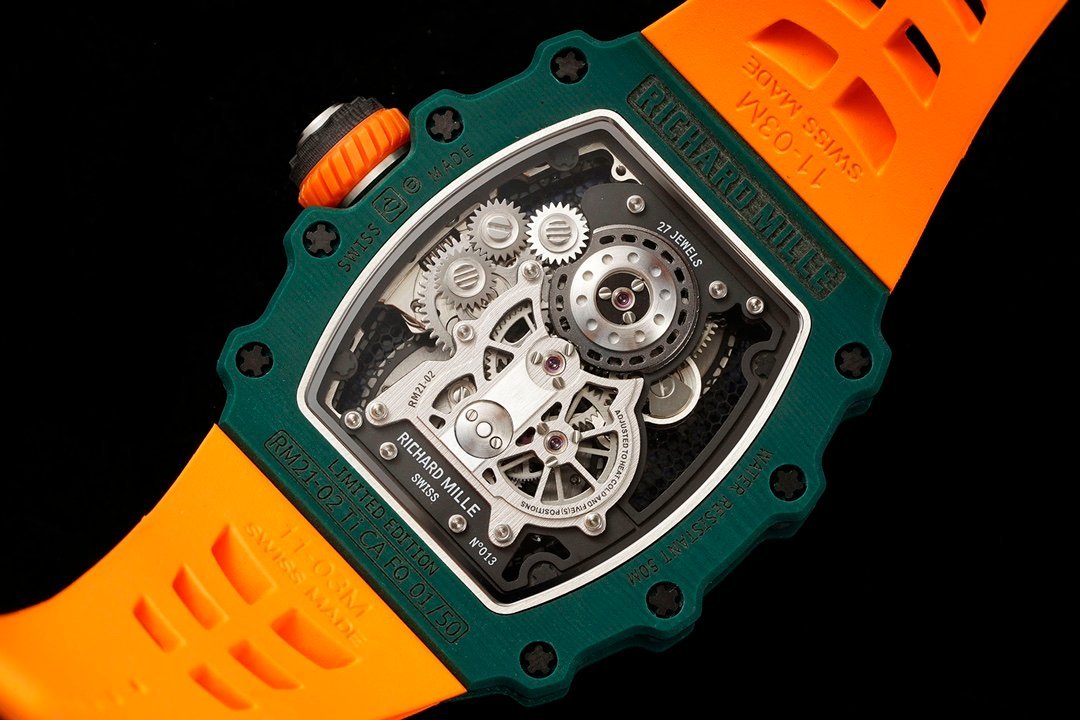 Get the Best Richard Mille RM 21-02 Tourbillon Aerodyne Replica, crafted with AAAA quality and Swiss movement for ultimate precision. The super clone features a case of 51mm x 17.5mm x 30mm, meticulously crafted with high-tech materials. Carbon TPT case, Titanium middle layer, and Green Quartz TPT bezel create a multi-layered future-like appearance.