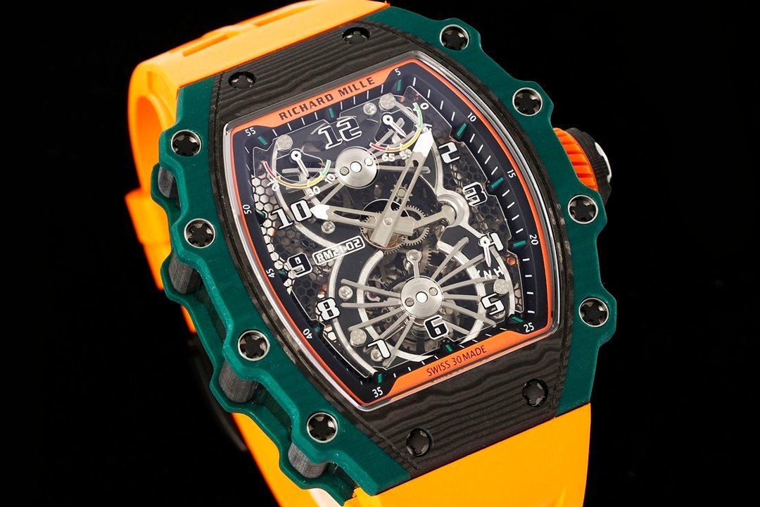 Best Richard Mille RM 21-02 Tourbillon Aerodyne Replica Watch – Orange Leather Strap — Premium 1:1 super clone. Case: Titanium / carbon composite tonneau case. Crystal: Genuine sapphire crystal front and back. Movement: Clone RM caliber (skeletonized automatic). 12-month movement warranty. Free worldwide shipping on orders over $1,200.