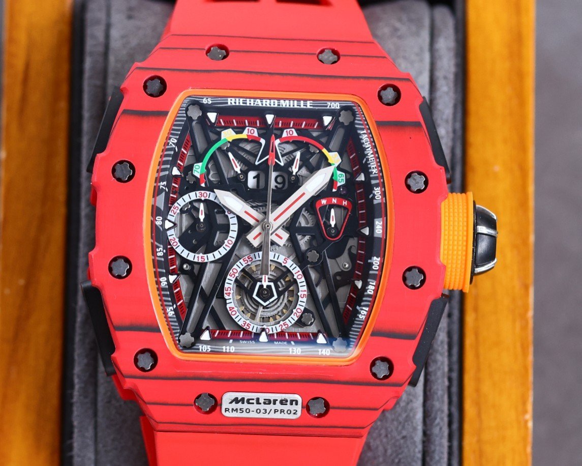 Best Richard Mille RM 50-03 Mclaren Replica Red Strap Watch For Men – Red Carbon Skeleton Dial with Swiss Movement — Premium 1:1 super clone. Case: Titanium / carbon composite tonneau case. Crystal: Genuine sapphire crystal front and back. Movement: Clone RM caliber (skeletonized automatic). 12-month movement warranty. Free worldwide shipping on orders over $1,200.
