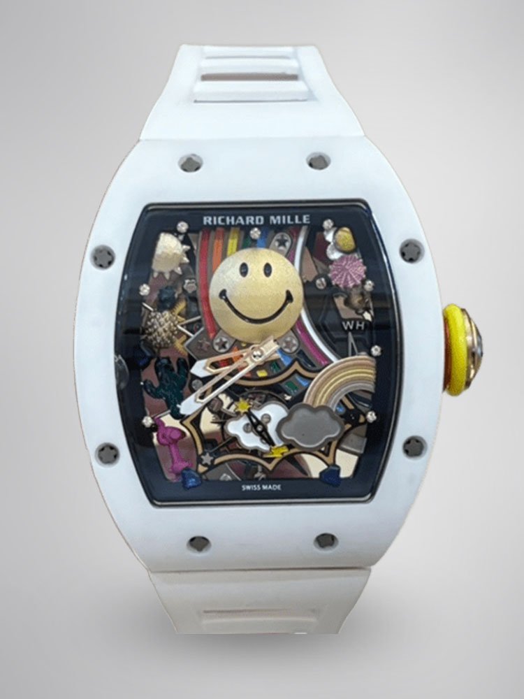 Meet the RM 88 Smiley Automatic Tourbillon Watch – a beautiful timepiece that unites happiness and accuracy in one gorgeous design. The unique dial boasts a big, multicolored Smiley face made of micro-sprayed and painted gold, with whimsical embellishments like flowers, sunshine, pineapples, cacti, flamingos, and a rainbow. At 6 o’clock, the Swiss movement is revealed in its intricate detail with clouds drifting past the minute hand and above a rainbow. The 48.15mm x 39.74mm stainless steel and ceramic case encases the Swiss automatic movement with flying tourbillon. On white rubber strap, this sporty look is water-resistant to 50 meters, as practical as it is fashionable. The RM 88 Smiley is indeed a gem for watch enthusiasts seeking the best of craftsmanship and playful design.</p