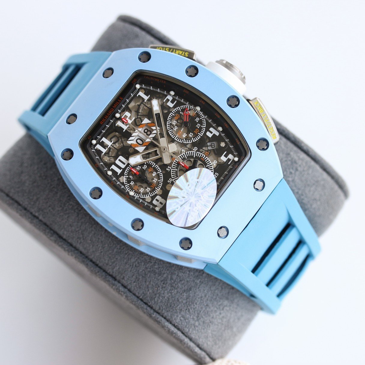 Enjoy the ultimate luxury watch experience with the Best Richard Mille RM11-03 Carbon Fiber Chronograph Replica Watch. This AAA Swiss-quality replica watch comes in a 50mm titanium case, coupled with a blue rubber strap and a blue ceramic fixed bezel that reflects power and elegance. The black skeleton dial, accompanied by silver-tone hands and Arabic numeral hour markers, provides a graphically striking, high-tech look, further complemented by a tachymeter scale on the outer rim.