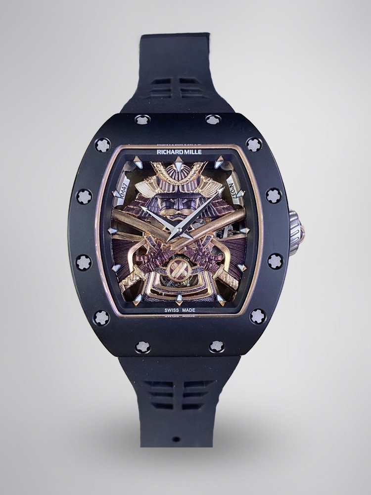 Experience the unparalleled craftsmanship of the Best Swiss RM47 Black Samurai Tourbillon Replica Watch. With a bold 43mm ceramic case, this watch exudes durability and sophistication. The intricate skeleton dial showcases a stunning Samurai armor motif, reflecting fine engraving and remarkable attention to detail. Equipped with a Swiss movement, it delivers precision and reliability, while the black rubber strap ensures a sporty yet comfortable fit.