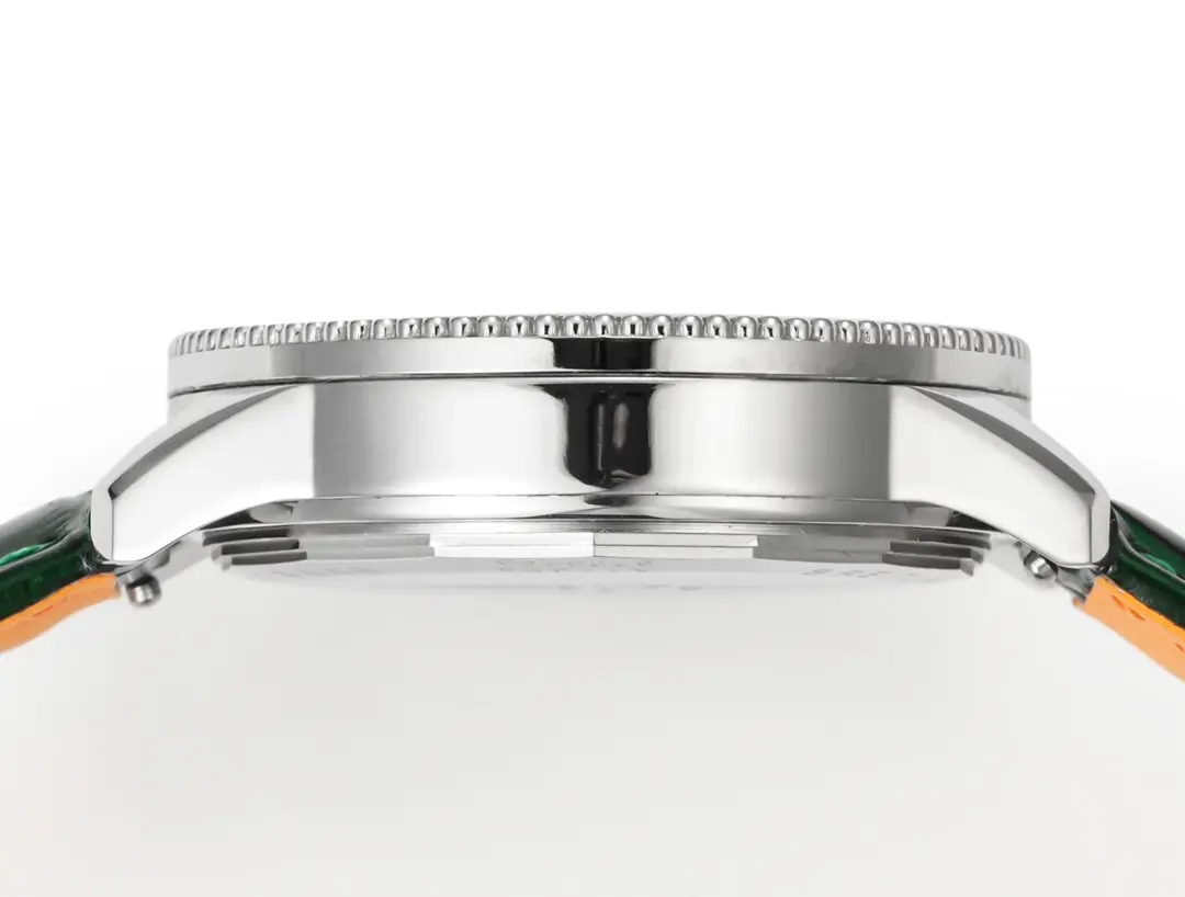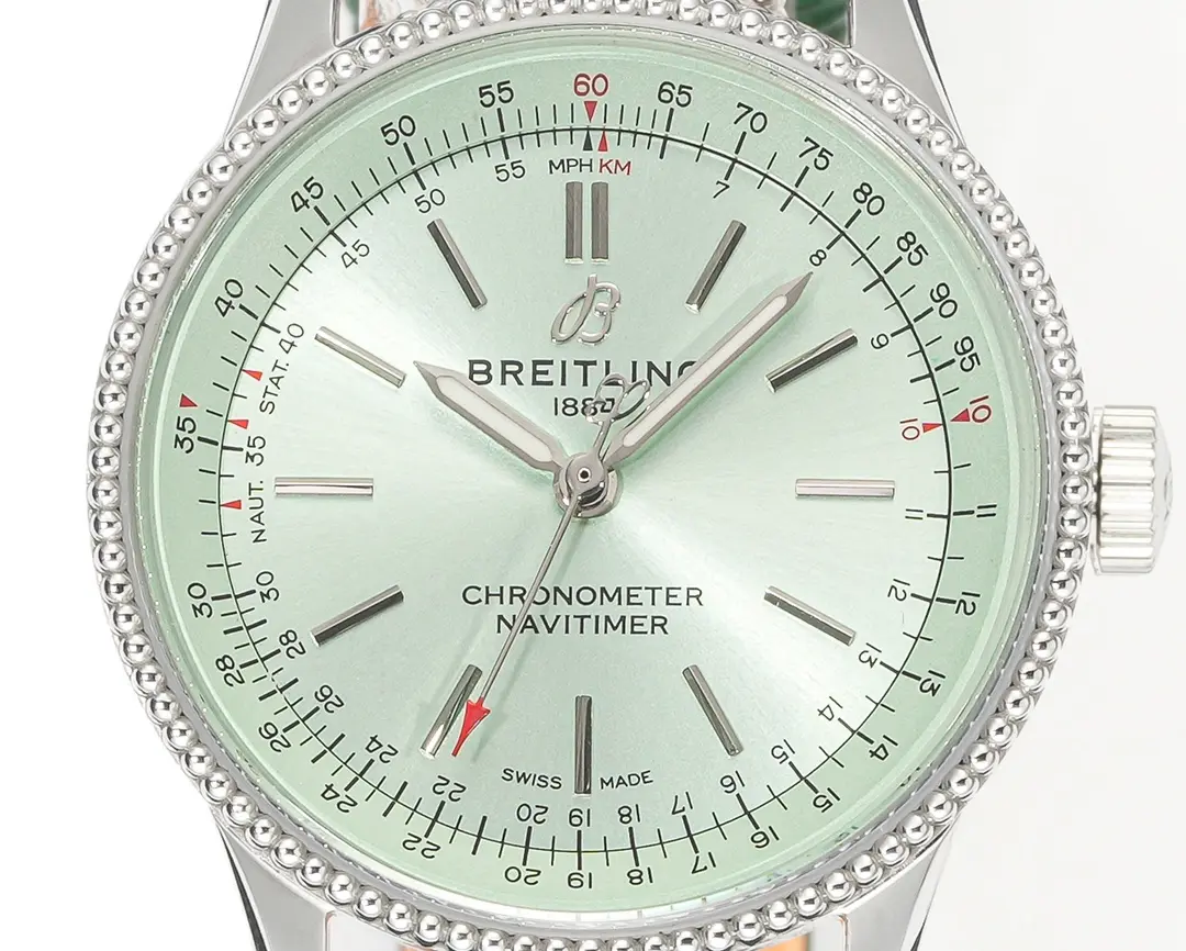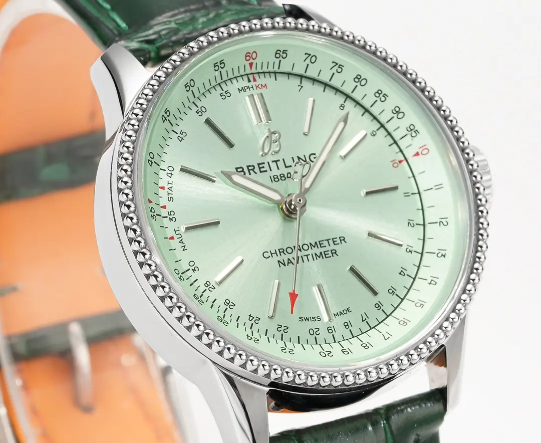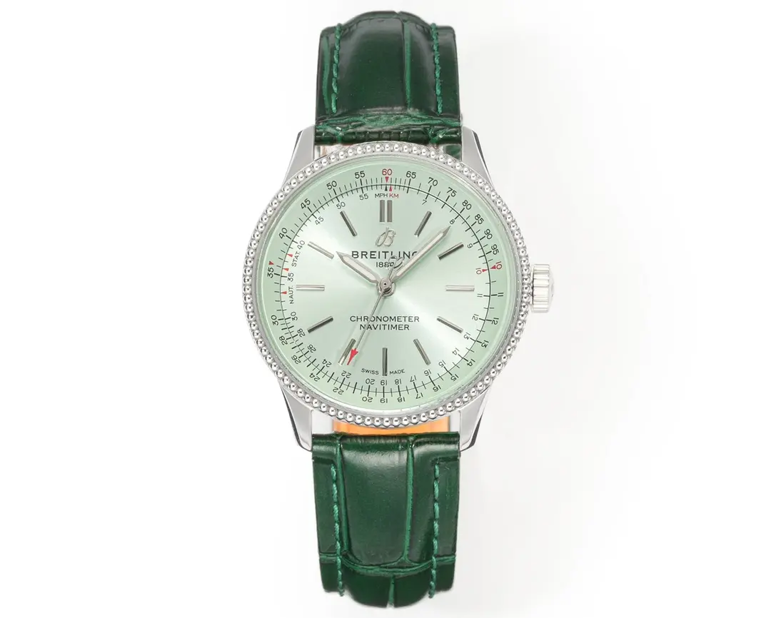 Breitling Navitimer Automatic Green Leather — Premium 1:1 super clone. Case: 316L stainless steel case, brushed and polished finish. Crystal: Genuine sapphire crystal with AR coating. Movement: Swiss ETA 7750 column-wheel chronograph (28,800 bph). 12-month movement warranty. Free worldwide shipping on orders over $1,200.