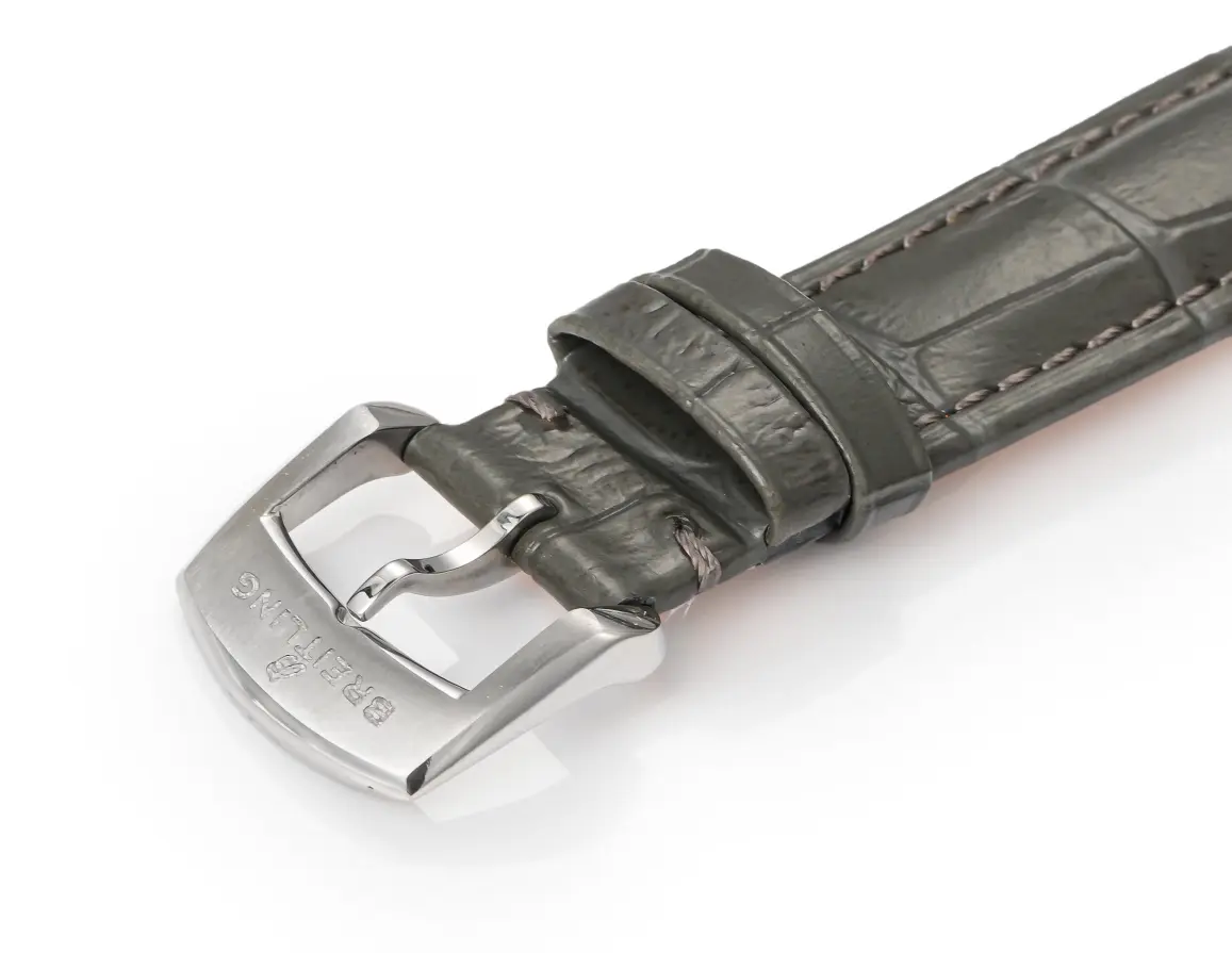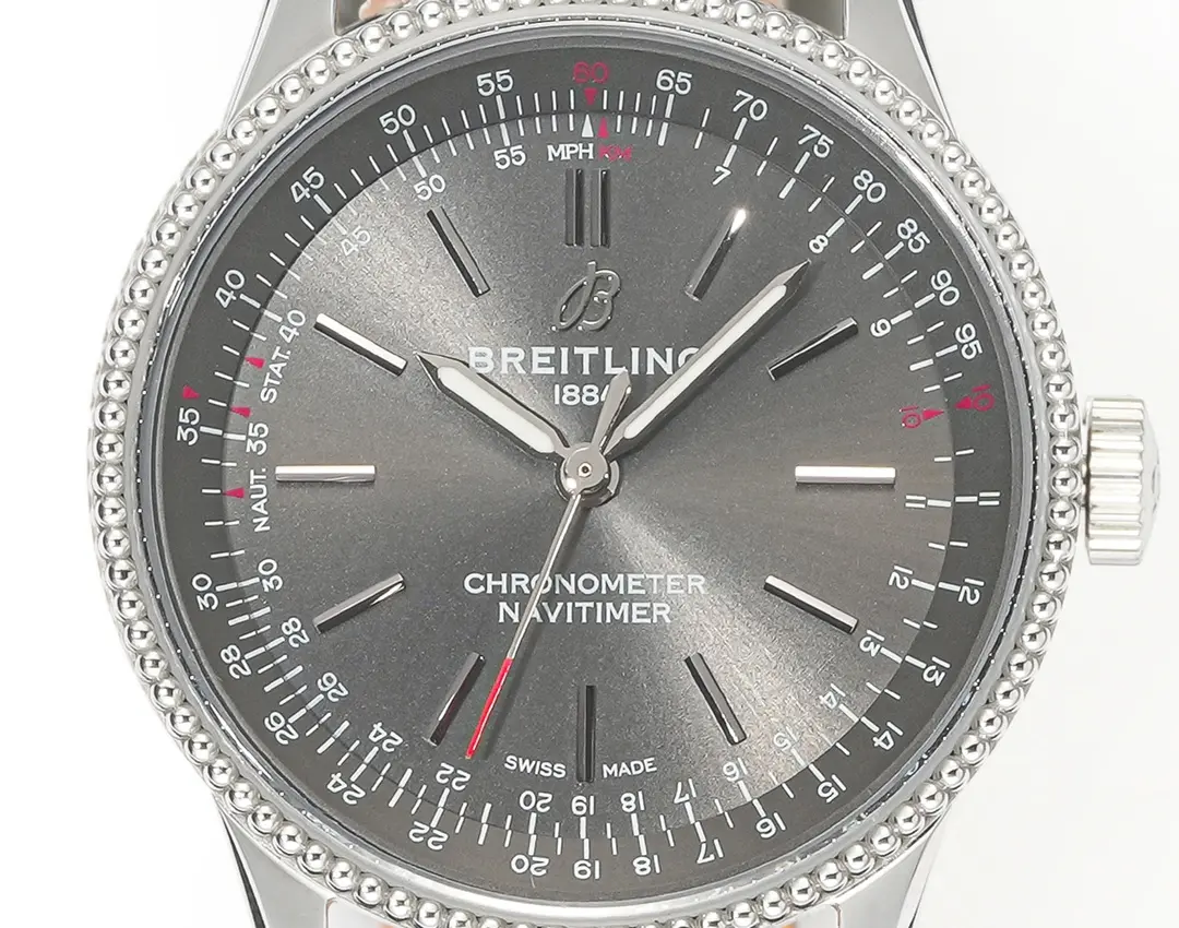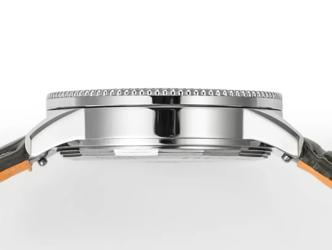 Breitling Navitimer Automatic Grey Dial Leather — Premium 1:1 super clone. Case: 316L stainless steel case, brushed and polished finish. Crystal: Genuine sapphire crystal with AR coating. Movement: Swiss ETA 7750 column-wheel chronograph (28,800 bph). 12-month movement warranty. Free worldwide shipping on orders over $1,200.