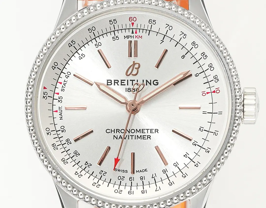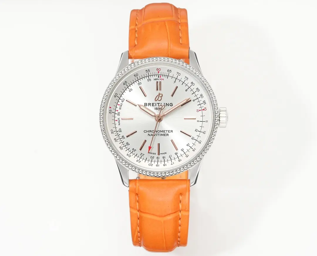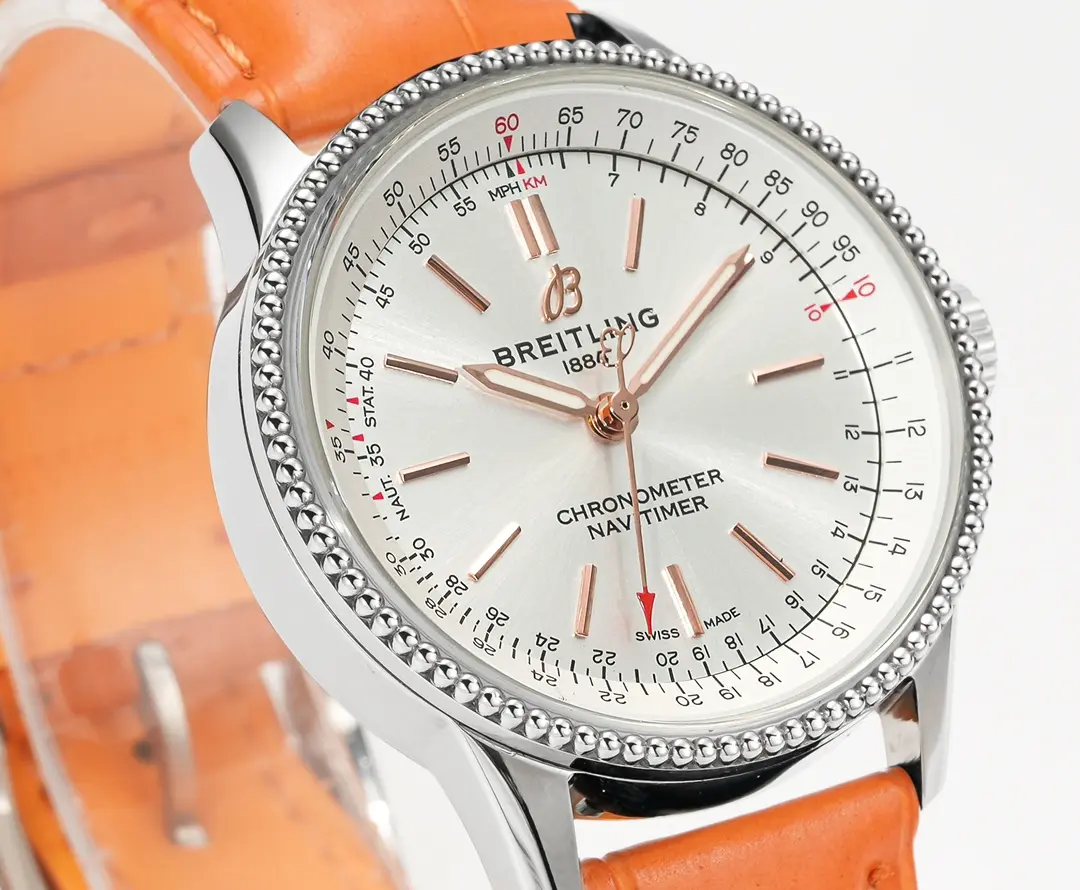 Breitling Navitimer Automatic Orange Leather — Premium 1:1 super clone. Case: 316L stainless steel case, brushed and polished finish. Crystal: Genuine sapphire crystal with AR coating. Movement: Swiss ETA 7750 column-wheel chronograph (28,800 bph). 12-month movement warranty. Free worldwide shipping on orders over $1,200.