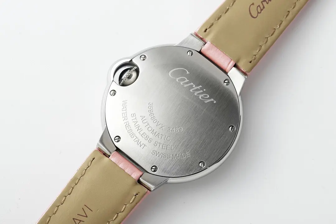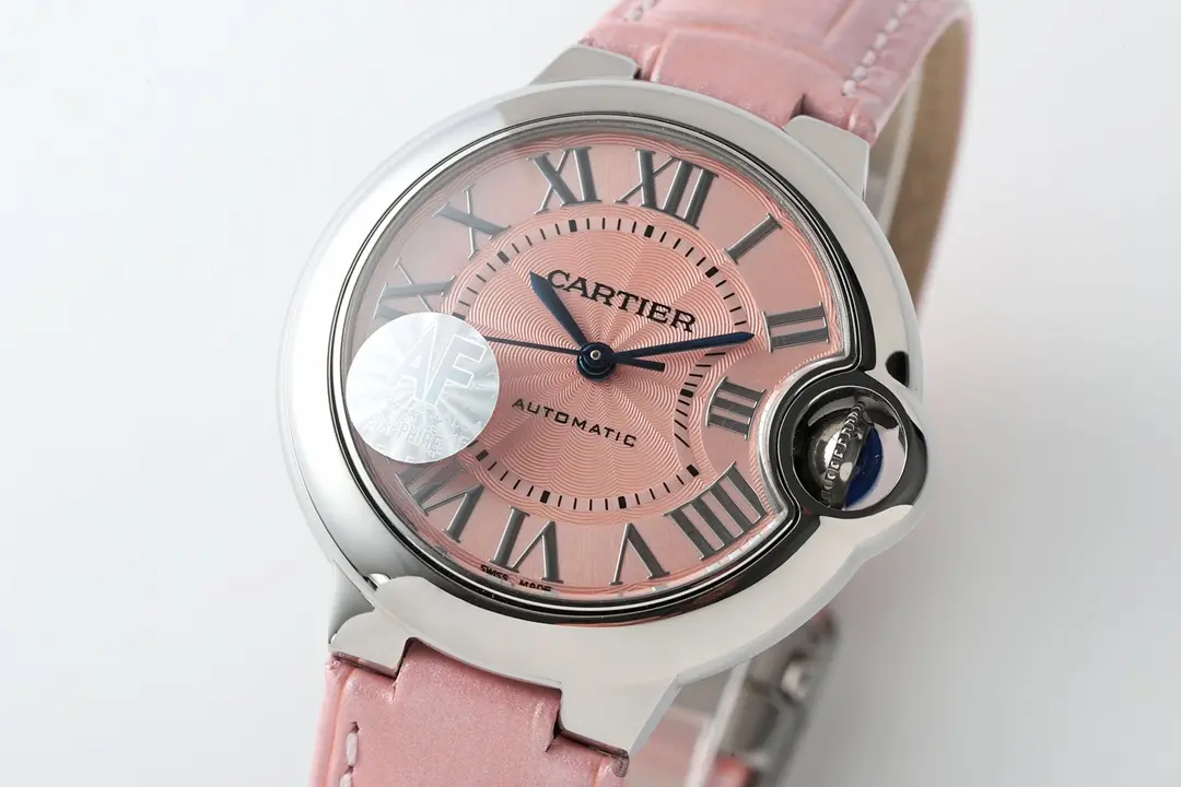 Cartier Ballon Bleu 33 Pink Leather — Premium 1:1 super clone. Case: Stainless steel case, silver-brushed or yellow gold PVD finish. Crystal: Genuine sapphire crystal with AR coating. Movement: Clone Cal. 1847 MC automatic. 12-month movement warranty. Free worldwide shipping on orders over $1,200.