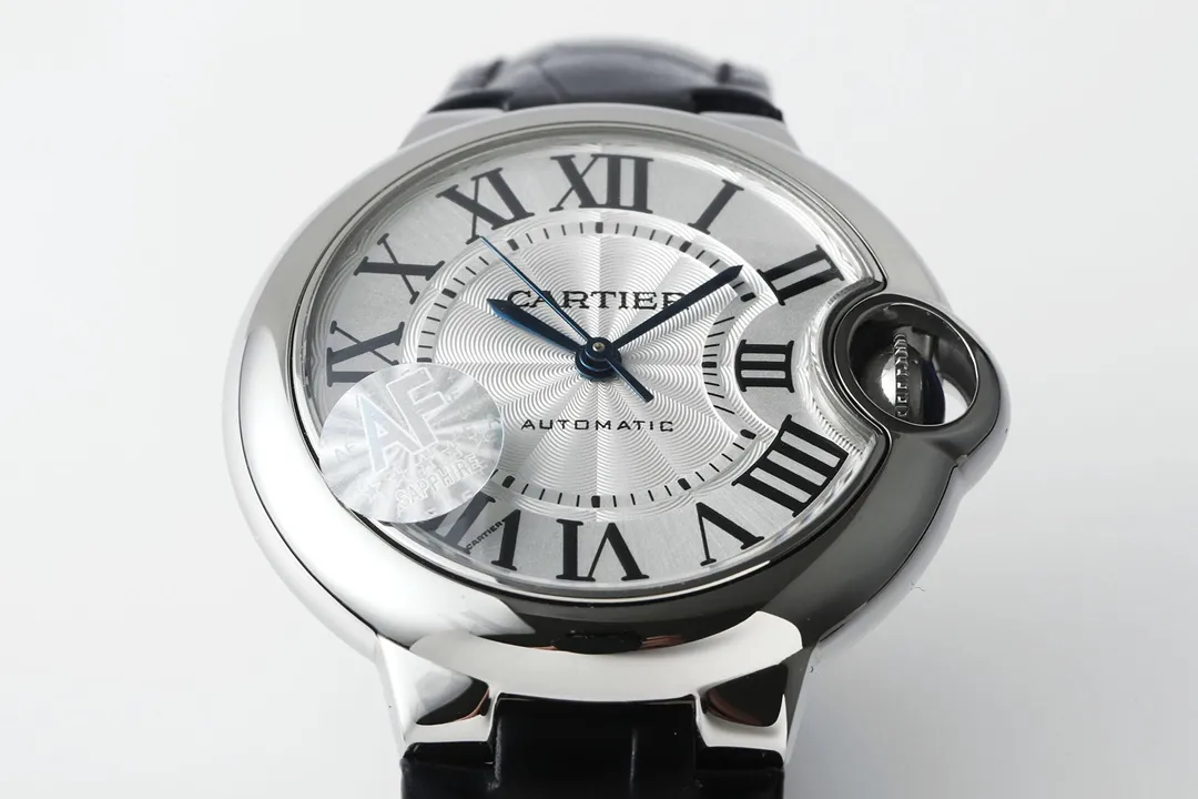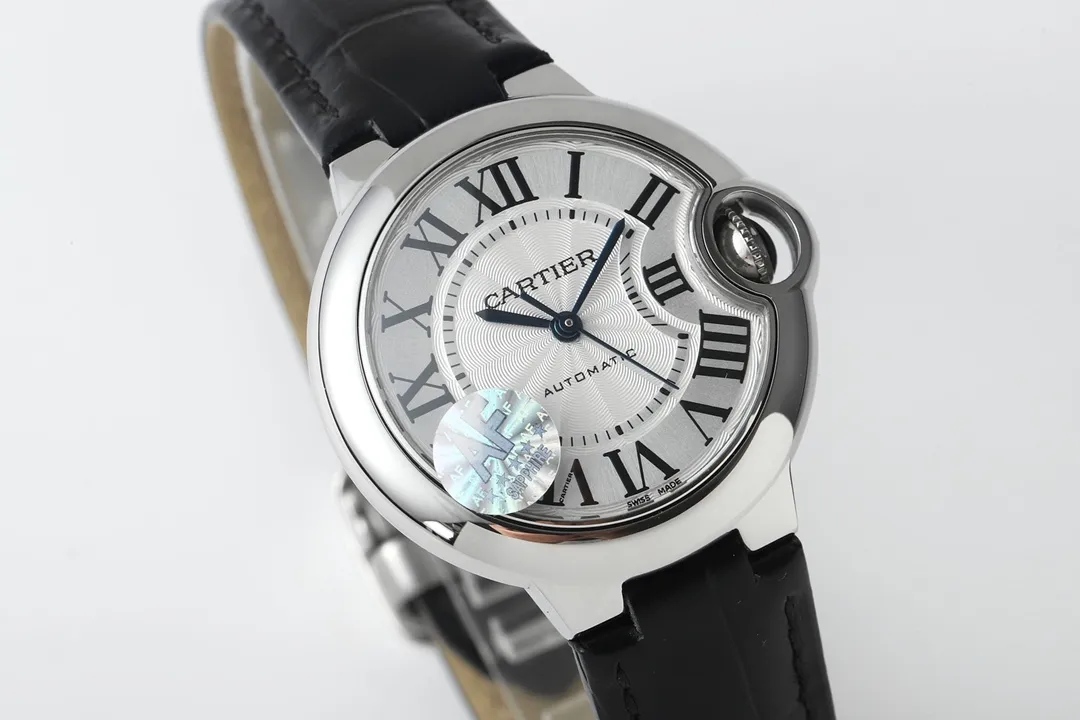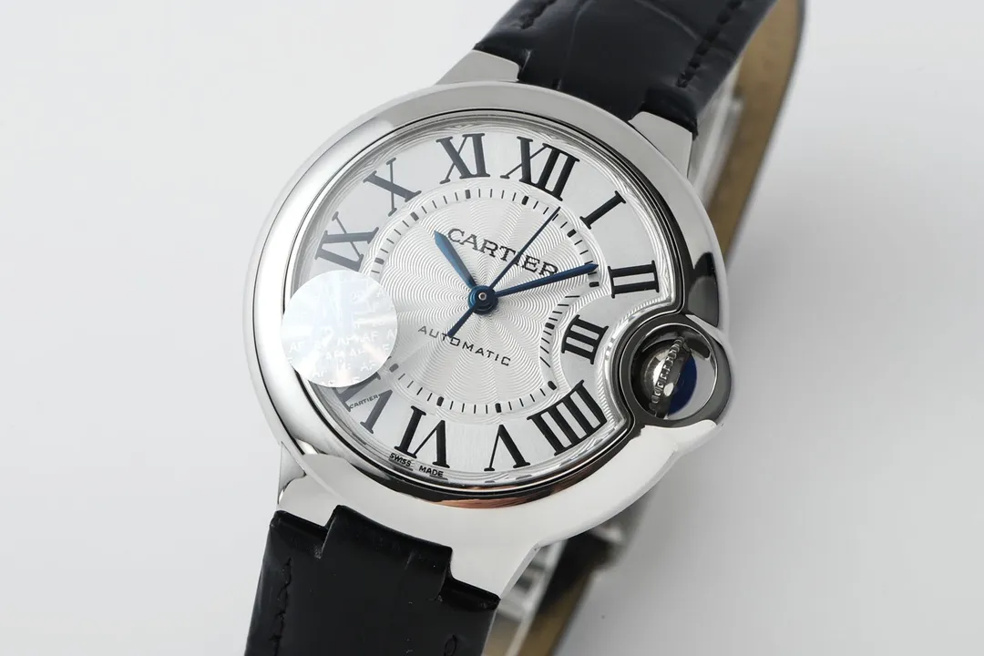 Cartier Ballon Bleu 33mm Silver White Leather — Premium 1:1 super clone. Case: Stainless steel case, silver-brushed or yellow gold PVD finish. Crystal: Genuine sapphire crystal with AR coating. Movement: Clone Cal. 1847 MC automatic. 12-month movement warranty. Free worldwide shipping on orders over $1,200.