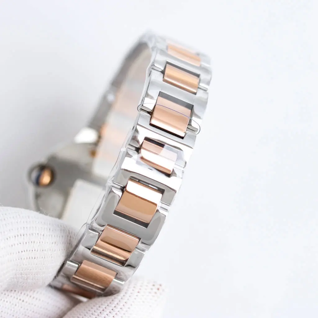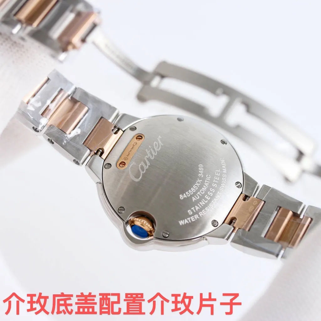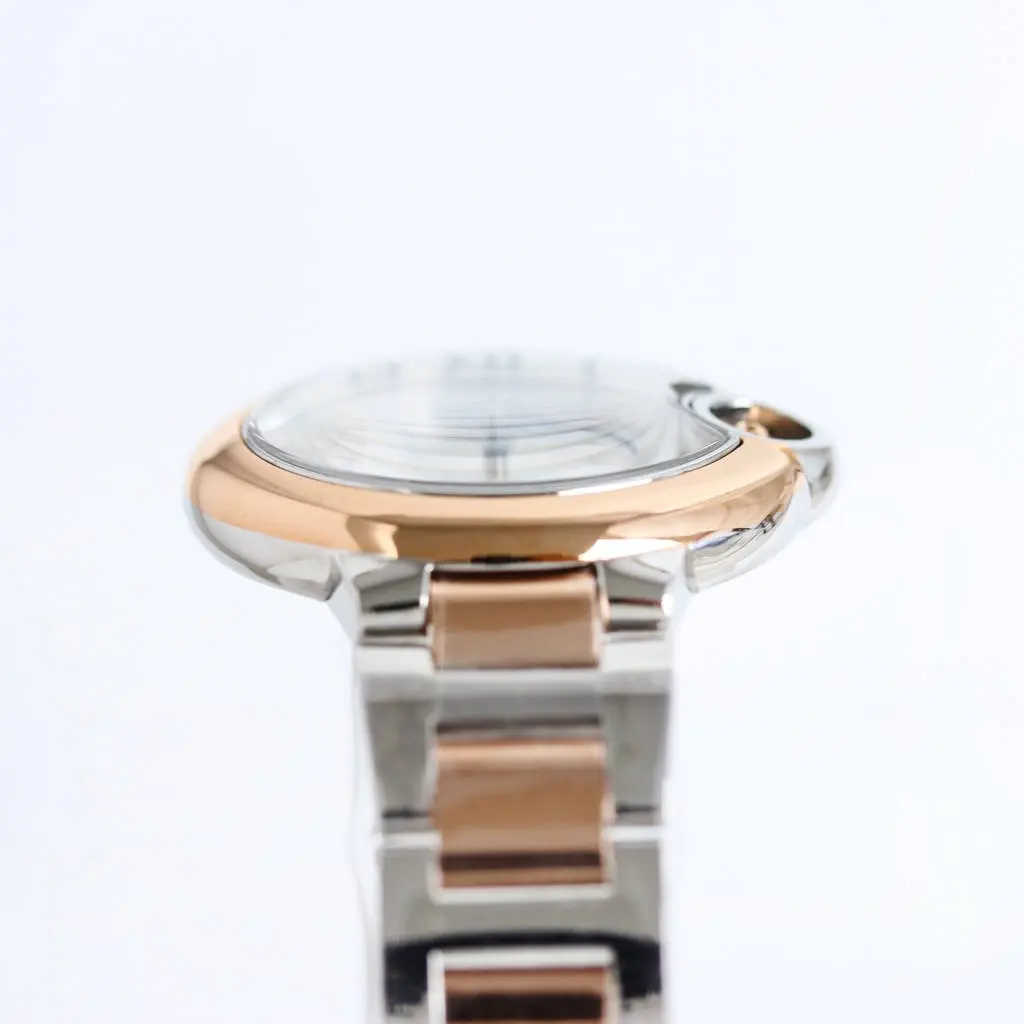 Cartier Ballon Bleu Automatic Rose Gold Steel — Premium 1:1 super clone. Case: Stainless steel case, silver-brushed or yellow gold PVD finish. Crystal: Genuine sapphire crystal with AR coating. Movement: Clone Cal. 1847 MC automatic. 12-month movement warranty. Free worldwide shipping on orders over $1,200.
