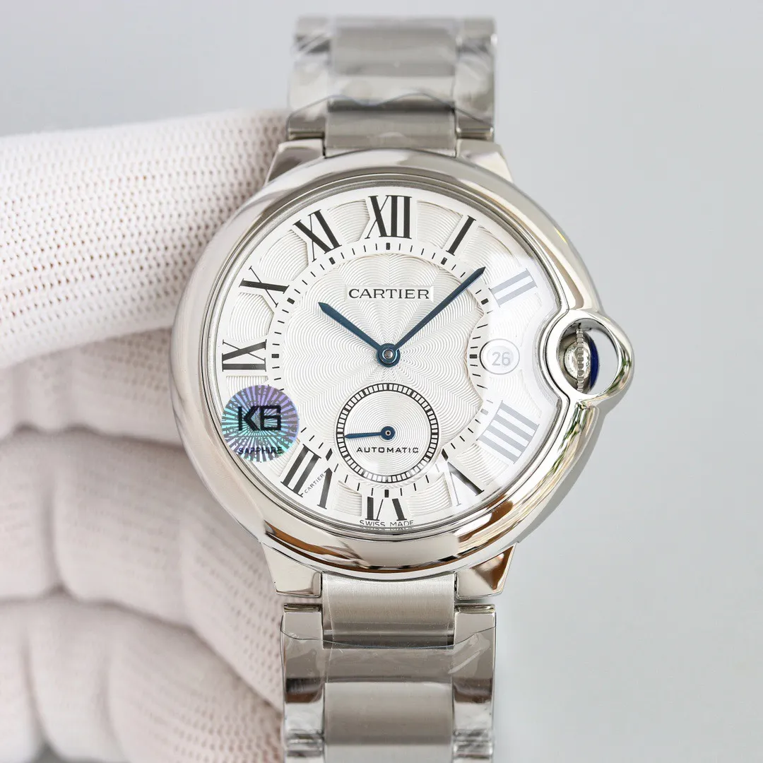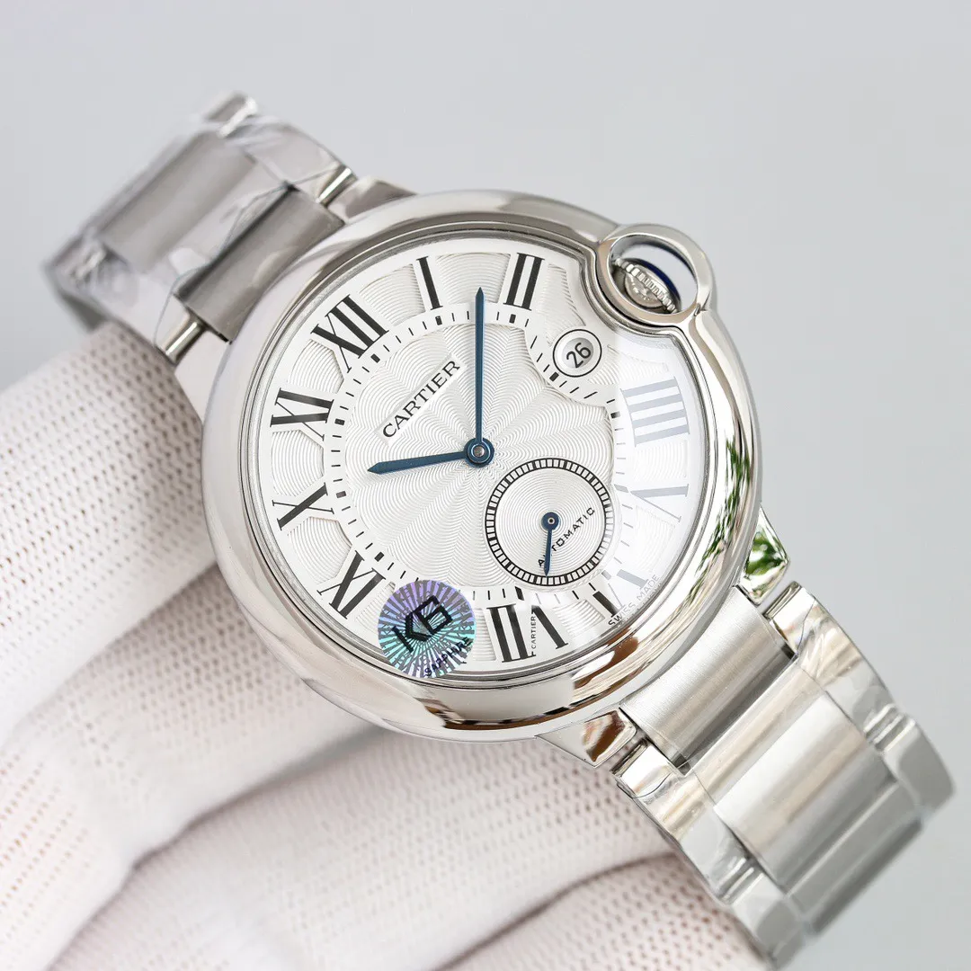 - Dial: White dial with Roman numerals and blue steel hands Hands: Blue sapphire crystal water drop shape Mechanical movement: Automatic Case: Polished stainless steel bracelet Subdial: 6 o’clock. Iconic Ballon Bleu Design With Cabochon Crown Description The Cartier Ballon Bleu Mens Watch Silver has a classic elegance. This 42mm watch has a white dial with roman numerals and blue hands. The sapphire glass is shaped like a drop of water. The automatic mechanical movement combines luxury with functionality. The polished stainless steel case and bracelet enhance its sophisticated look, which makes it a great addition to any wardrobe. Explore options such as