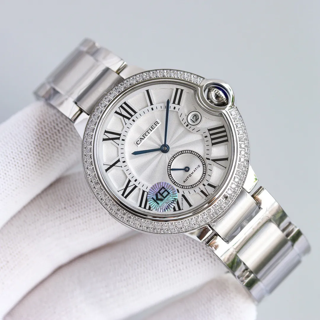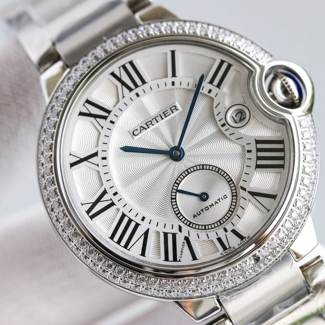 Cartier Ballon Bleu Two Hand Watch Silver — Premium 1:1 super clone. Case: Stainless steel case, silver-brushed or yellow gold PVD finish. Crystal: Genuine sapphire crystal with AR coating. Movement: Clone Cal. 1847 MC automatic. 12-month movement warranty. Free worldwide shipping on orders over $1,200.
