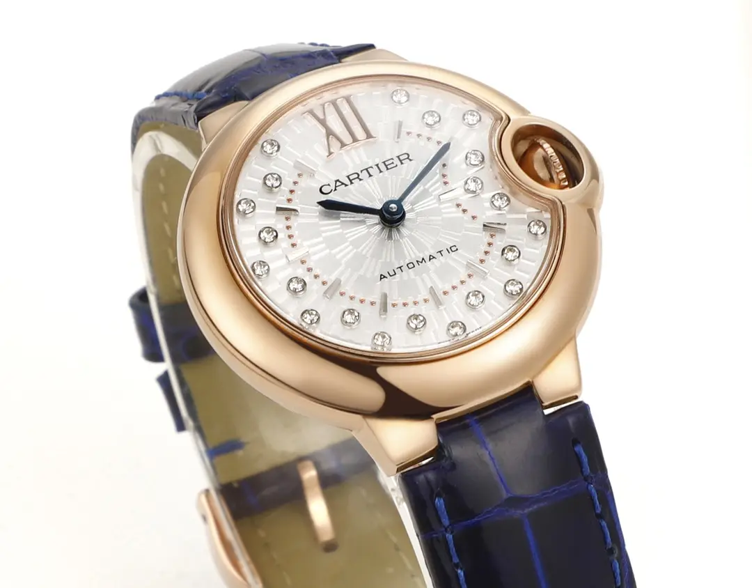 Cartier Ballon Bleu WJBB0080 Rose Gold Blue Leather — Premium 1:1 super clone. Case: Stainless steel case, silver-brushed or yellow gold PVD finish. Crystal: Genuine sapphire crystal with AR coating. Movement: Clone Cal. 1847 MC automatic. 12-month movement warranty. Free worldwide shipping on orders over $1,200.