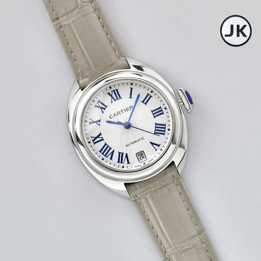 • The sapphire crystal is resistant to scratches and offers clarity. A grey leather strap adds an elegant touch to the watch. Roman Numerals This dial features raised Roman numerals, which give it an elegant and clean appearance. This Cartier CLE DE Cartier key automatic watch features a silver case and a grey leather band. This timepiece has a combination of elegance, precision, and durability. Explore options such as a