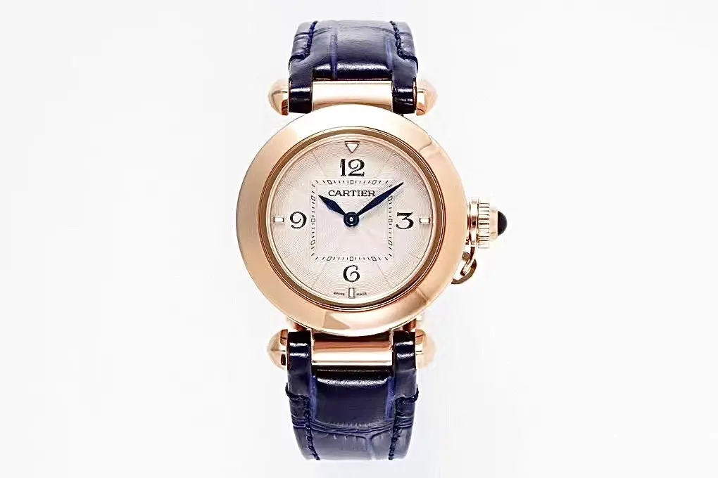 Cartier Pasha de Cartier Ladies Watch Rose Gold Blue Leather — Premium 1:1 super clone. Case: Stainless steel case, silver-brushed or yellow gold PVD finish. Crystal: Genuine sapphire crystal with AR coating. Movement: Clone Cal. 1847 MC automatic (28,800 bph). 12-month movement warranty. Free worldwide shipping on orders over $1,200.