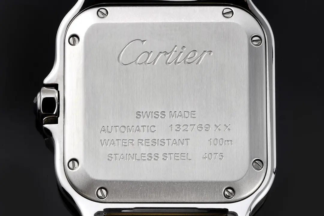 Cartier Santos de Cartier Watch Silver Gold White — Premium 1:1 super clone. Case: Stainless steel case, silver-brushed or yellow gold PVD finish. Crystal: Genuine sapphire crystal with AR coating. Movement: Clone Cal. 1847 MC automatic (28,800 bph). 12-month movement warranty. Free worldwide shipping on orders over $1,200.