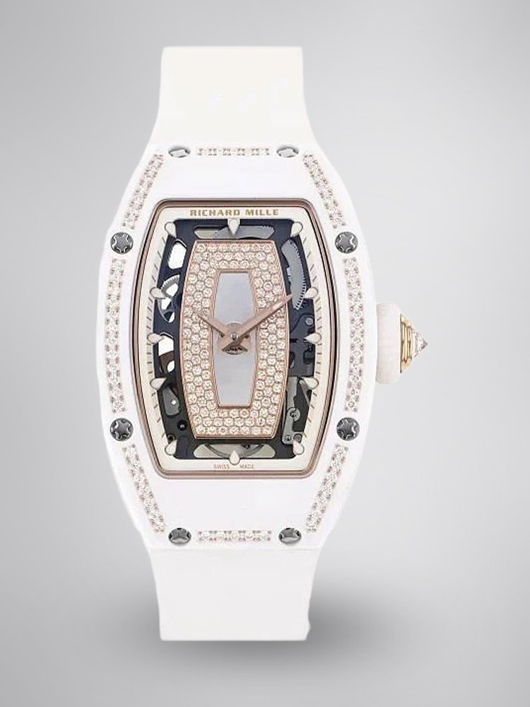 Elegant Swiss Richard Mille RM 07-01 Replica White Ceramic & Rose Gold Diamond Dial Watch – Luxury Style For Women — Premium 1:1 super clone. Case: Titanium / carbon composite tonneau case. Crystal: Genuine sapphire crystal front and back. Movement: Clone RM caliber (skeletonized automatic). 12-month movement warranty. Free worldwide shipping on orders over $1,200.