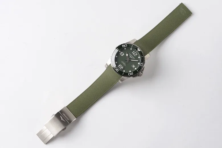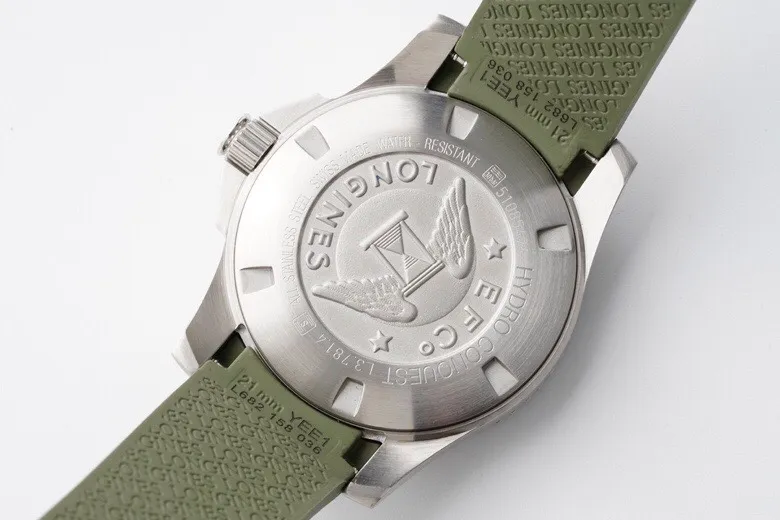 Experience the Longines Conquest Diver Watch, a masterpiece of craftsmanship with a green rubber strap and automatic movement. Its 41mm stainless steel case and ceramic bezel make it a standout piece for any collection.