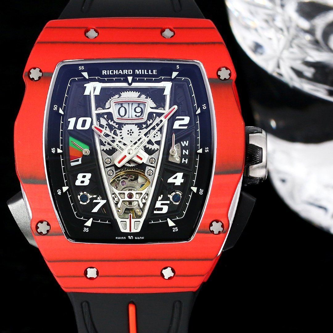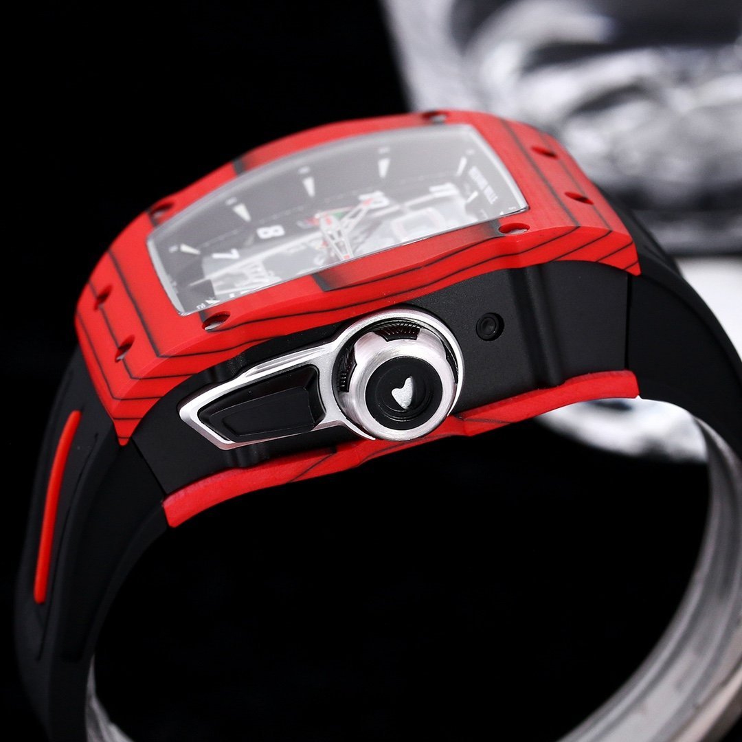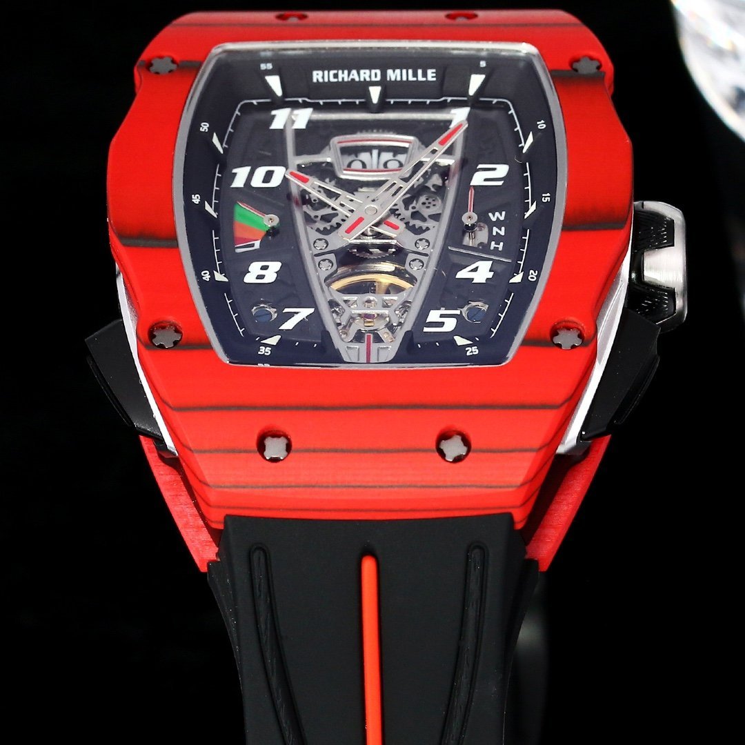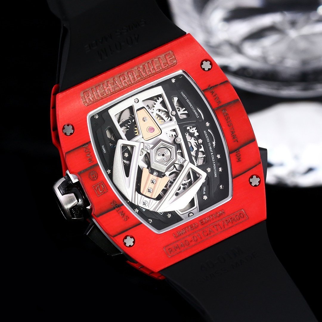 Luxury Sport Replica Richard Mille RM 40-01 Red Carbon Fiber Case Watch With Black Rubber Strap — Premium 1:1 super clone. Case: Titanium / carbon composite tonneau case. Crystal: Genuine sapphire crystal front and back. Movement: Clone RM caliber (skeletonized automatic). 12-month movement warranty. Free worldwide shipping on orders over $1,200.