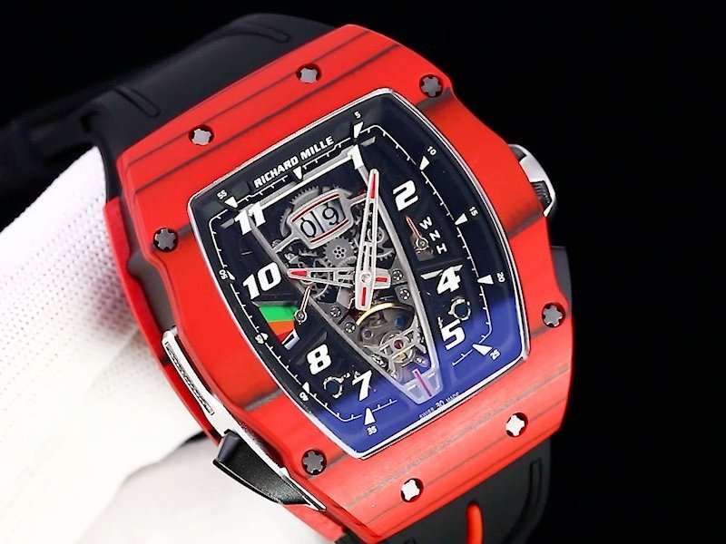 The replica Richard Mille RM 40-01 is immediately distinguishable by its brazen and sporty charisma on top of its complex mechanical engineering. Its 48.25mm × 41.80mm red carbon fiber case contrasts sharply against the black rubber band that provides both comfort and a strong visual impact. The skeletonized dial reveals the complexity of the mechanical structure below the dial, with 3-dimensional Arabic numeral hour markers bringing a contemporary and high-tech flair.