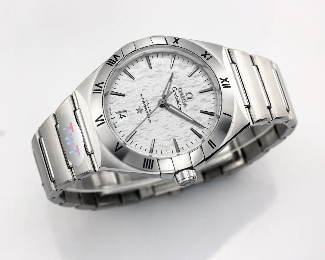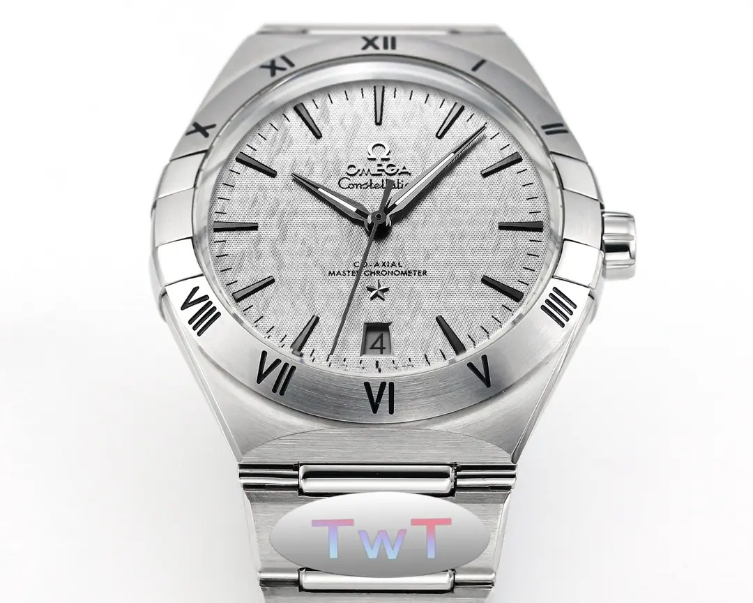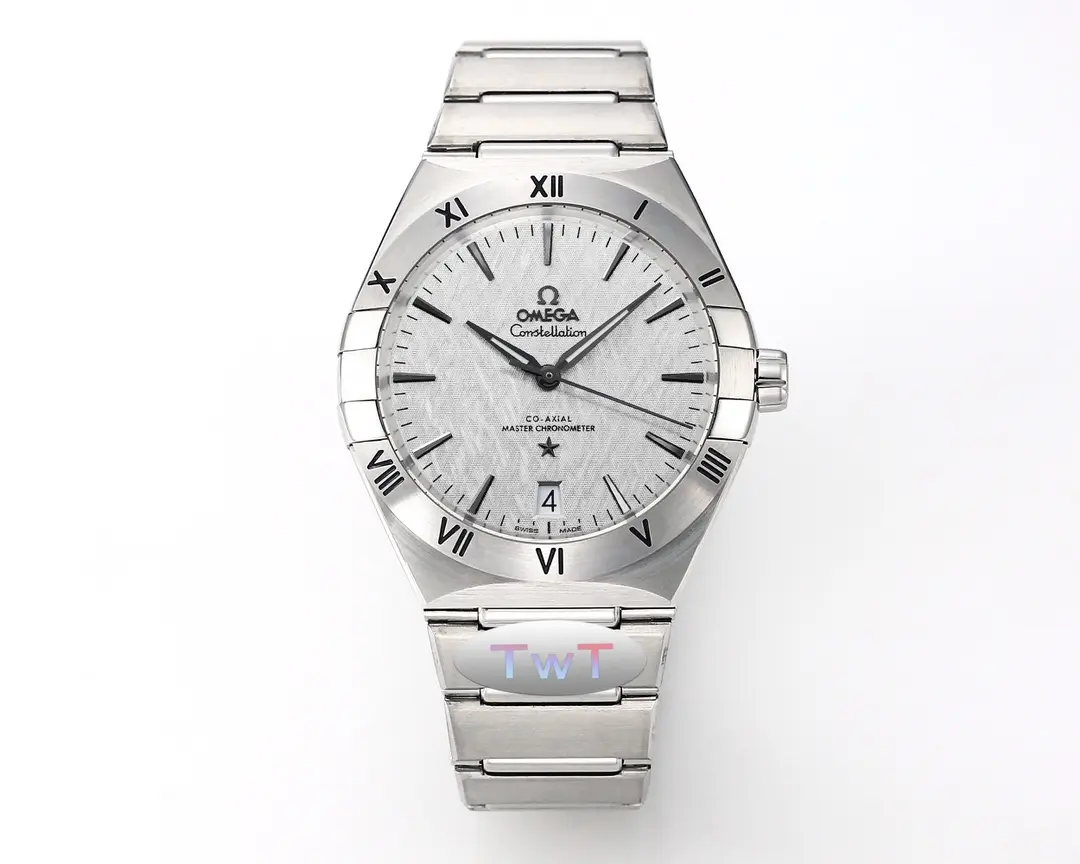 Omega Constellation Ceramic Silver — Premium 1:1 super clone. Case: 316L stainless steel case with brushed/polished finish. Crystal: Genuine sapphire crystal with AR coating. Movement: Swiss ETA 2824-2 (28,800 bph, date). 12-month movement warranty. Free worldwide shipping on orders over $1,200.