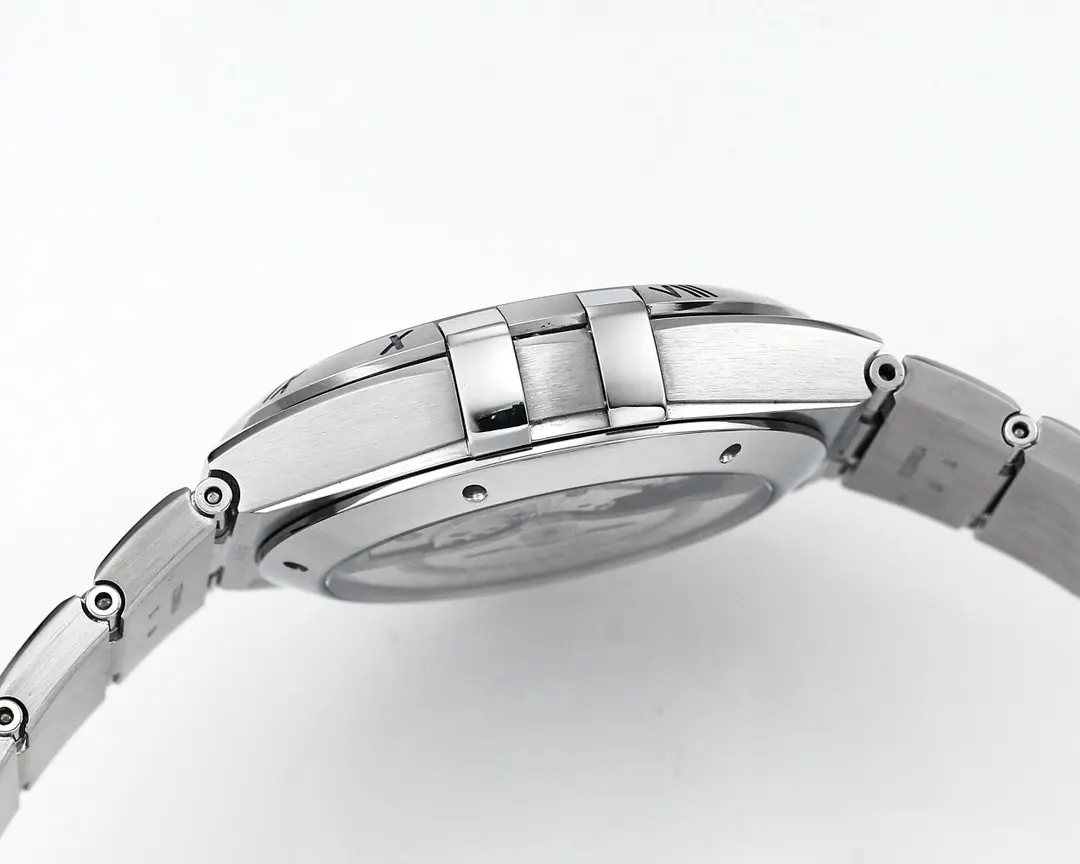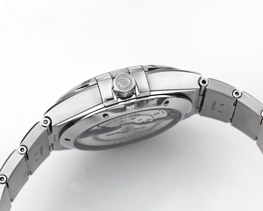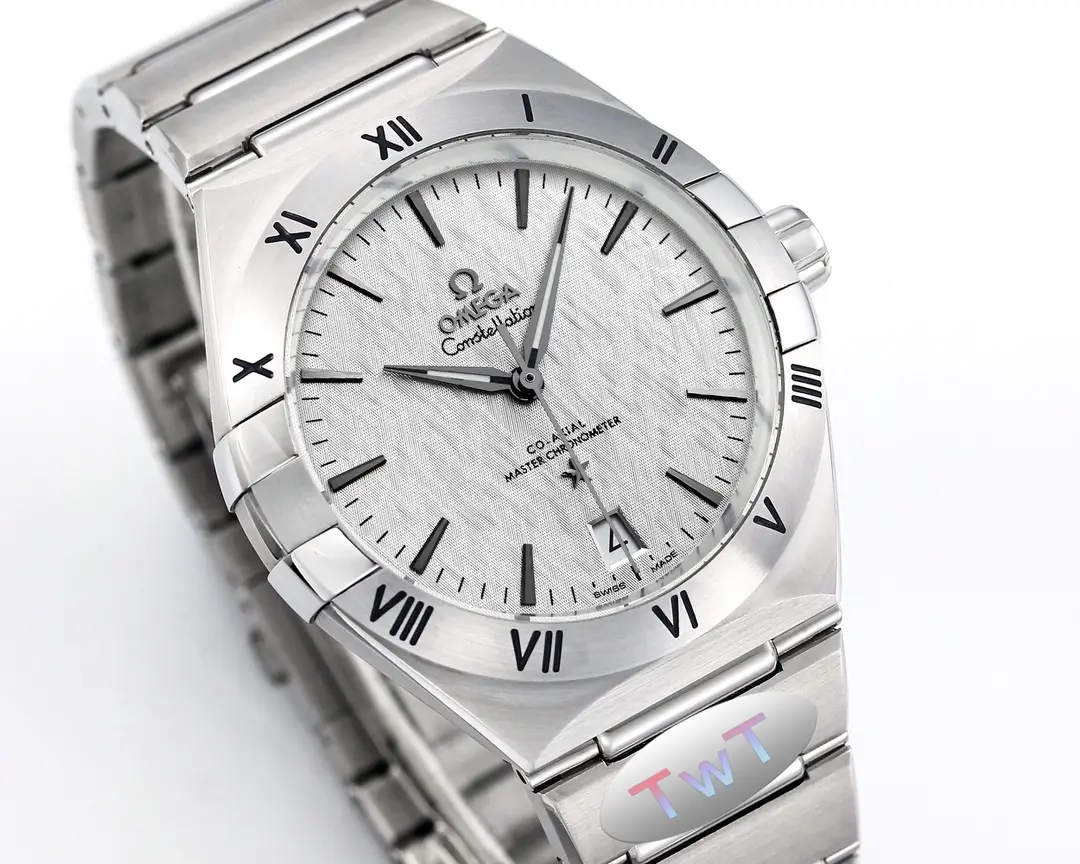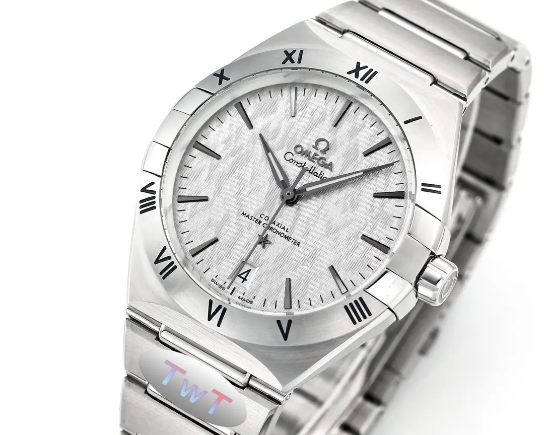 Omega Constellation Ceramic Silver — Premium 1:1 super clone. Case: 316L stainless steel case with brushed/polished finish. Crystal: Genuine sapphire crystal with AR coating. Movement: Swiss ETA 2824-2 (28,800 bph, date). 12-month movement warranty. Free worldwide shipping on orders over $1,200.