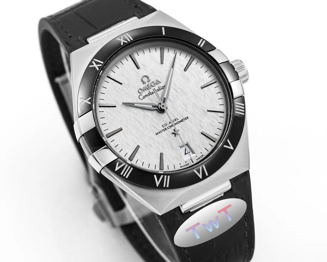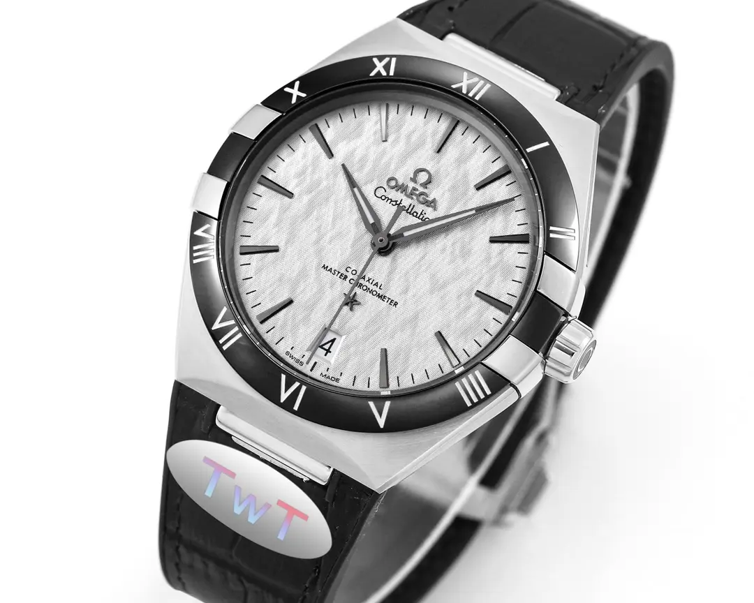 Omega Constellation Meteorite Watch Black Leather — Premium 1:1 super clone. Case: 316L stainless steel case with brushed/polished finish. Crystal: Genuine sapphire crystal with AR coating. Movement: Swiss ETA 2824-2 (28,800 bph, date). 12-month movement warranty. Free worldwide shipping on orders over $1,200.