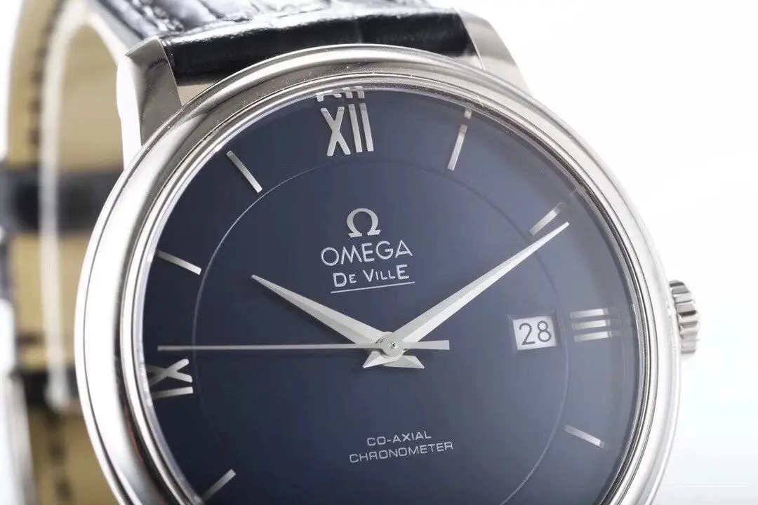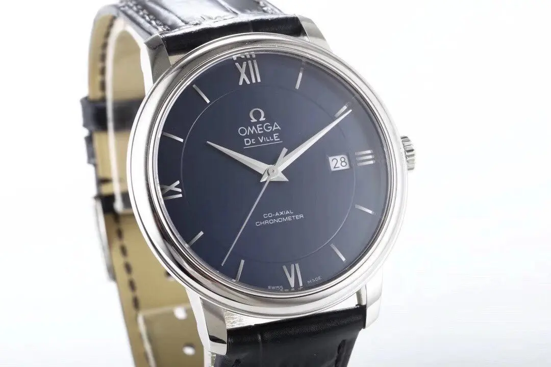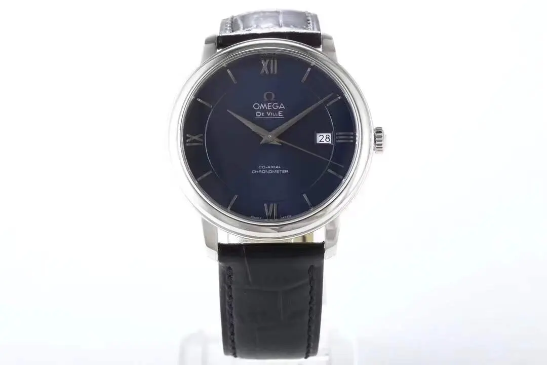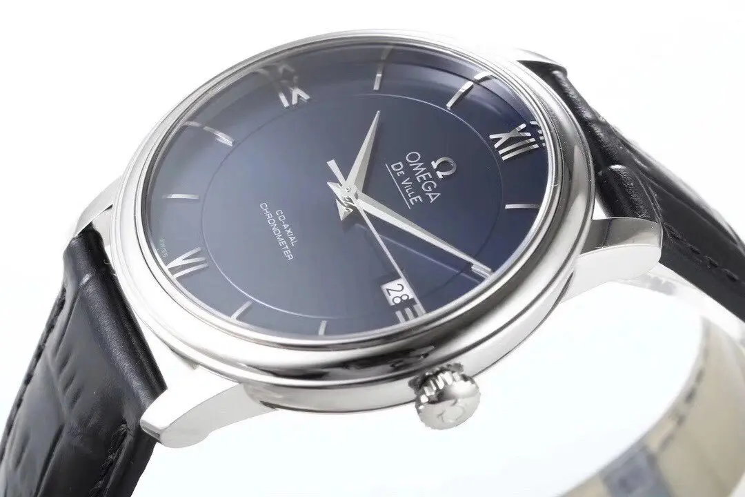 Omega De Ville Blue Dial Leather — Premium 1:1 super clone. Case: 316L stainless steel case with brushed/polished finish. Crystal: Genuine sapphire crystal with AR coating. Movement: Swiss ETA 2824-2 (28,800 bph). 12-month movement warranty. Free worldwide shipping on orders over $1,200.