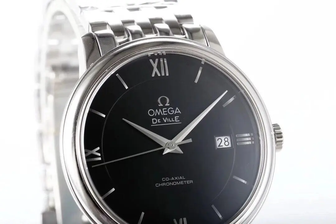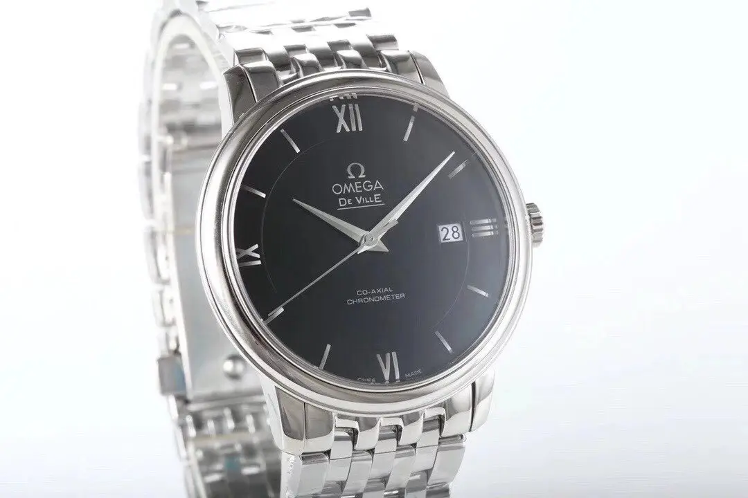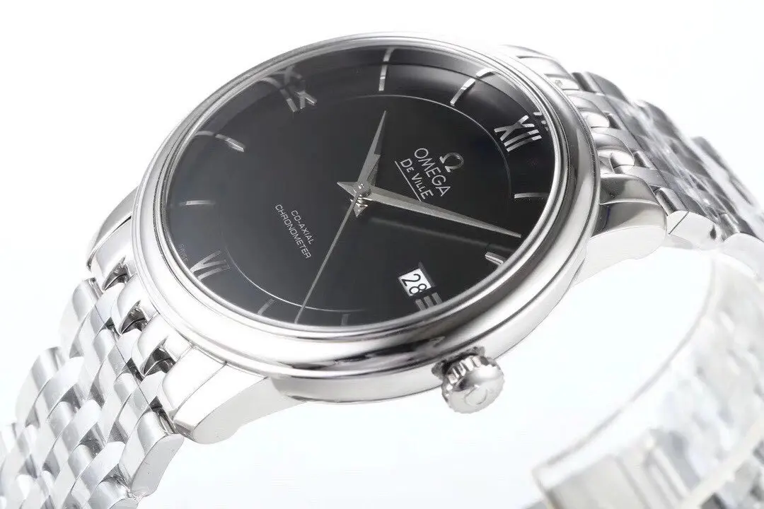 Omega De Ville Prestige Black Dial Steel — Premium 1:1 super clone. Case: 316L stainless steel case with brushed/polished finish. Crystal: Genuine sapphire crystal with AR coating. Movement: Swiss ETA 2824-2 (28,800 bph). 12-month movement warranty. Free worldwide shipping on orders over $1,200.
