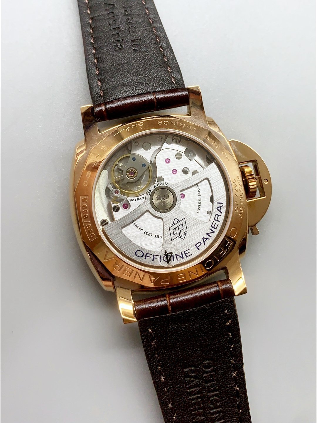 Genuine Swiss Modified 7750 movement Reassembled to resemble the P9010 Movement. Bridges and Rotor Decorated to resemble the Calibre 9010 Movement by Panerai