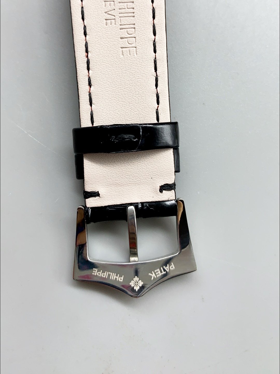 Genuine Leather Strap with Stainless Steel Tang buckle complete with Patek Philippe Markings and Engravings