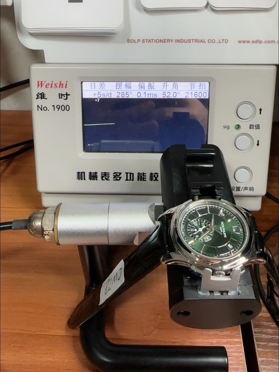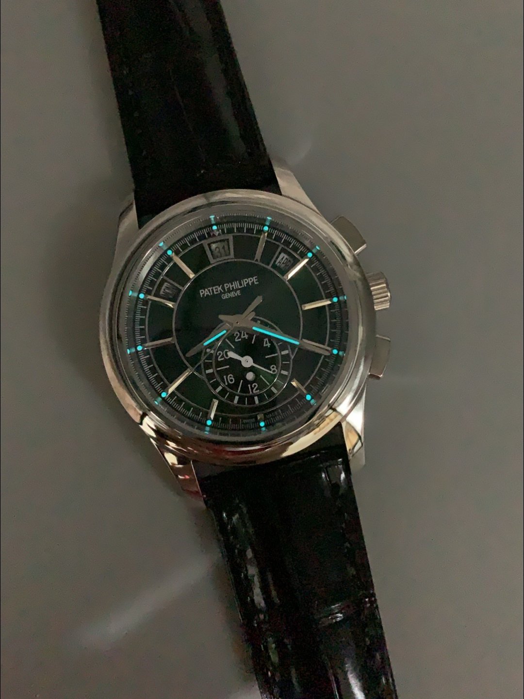 Green Dial with Functional Day/Date and Month Indicator. Moon Phase Indicator functions as 12/24 Hour Counter