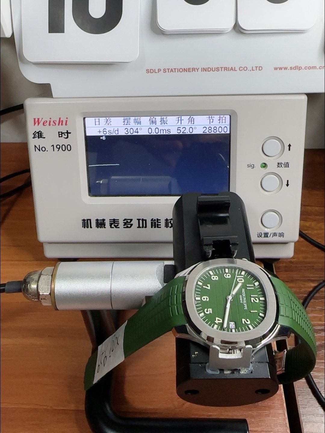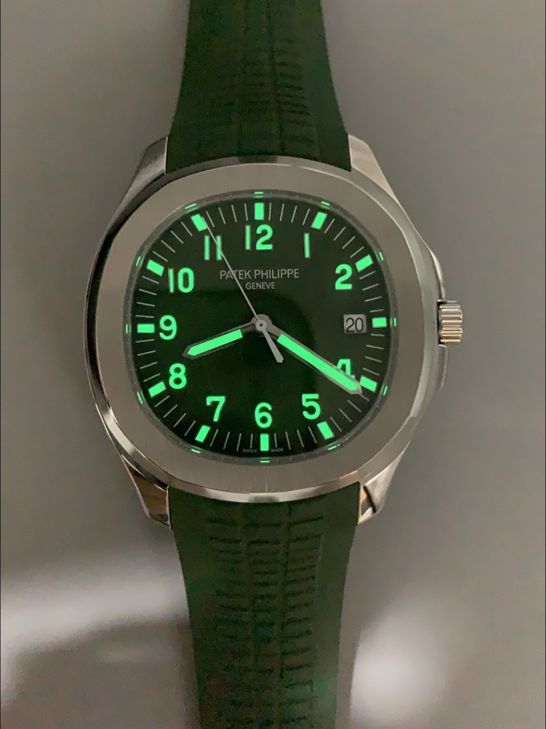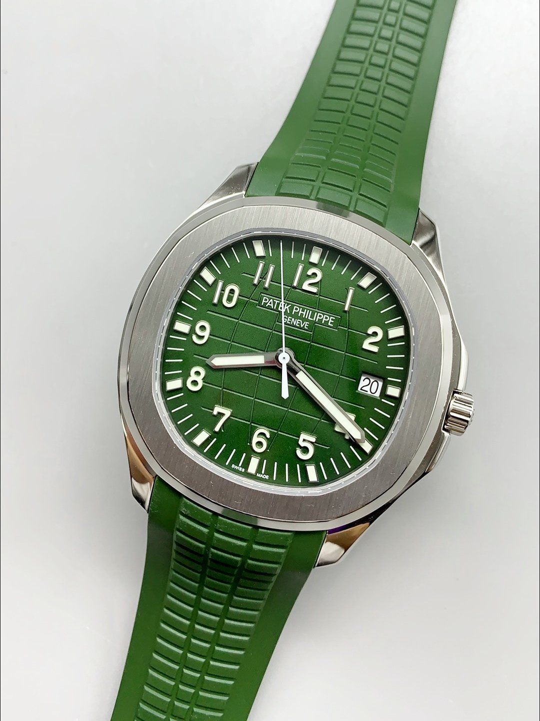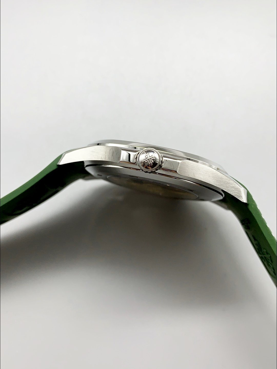 Green Curved Rubber Strap with Steel Folding Clasp complete with Patek Philippe Markings. A Highly Updated Clasps for this series with much more accurate markings/engravings.