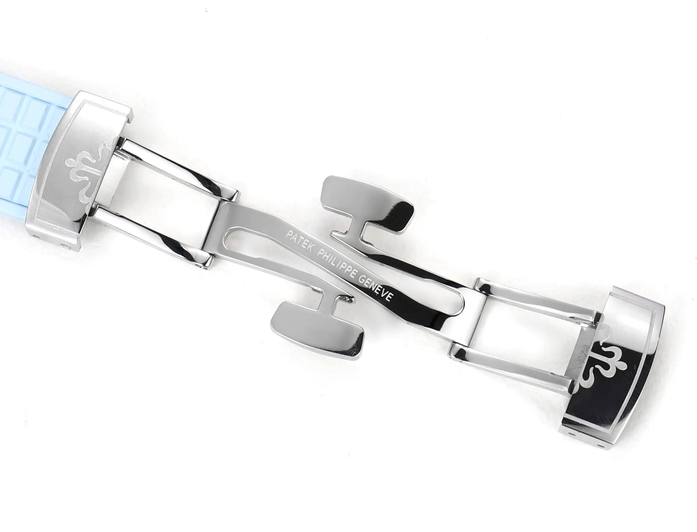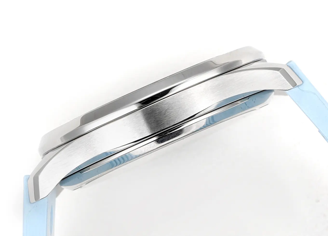 Patek Philippe Aquanaut Blue Rubber — Premium 1:1 super clone. Case: 904L stainless steel or 18k gold case. Crystal: Genuine sapphire crystal with AR coating. Movement: Clone Cal. 5167A (28,800 bph, date). 12-month movement warranty. Free worldwide shipping on orders over $1,200.
