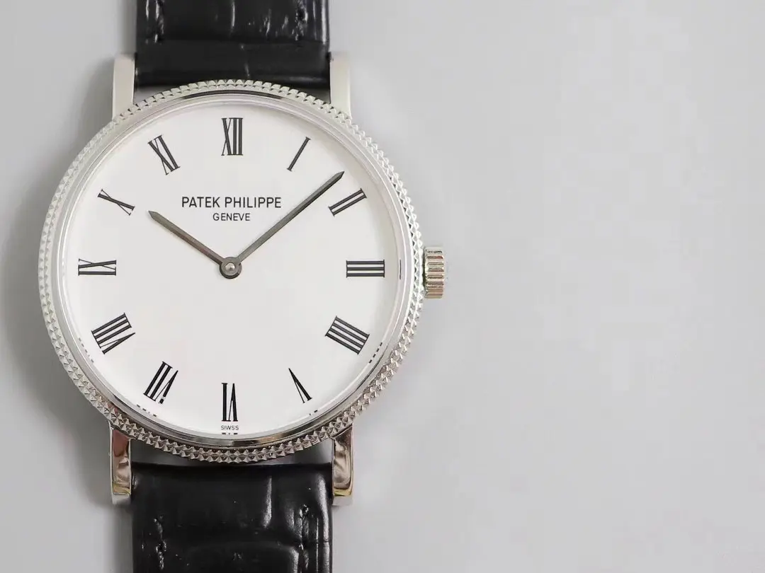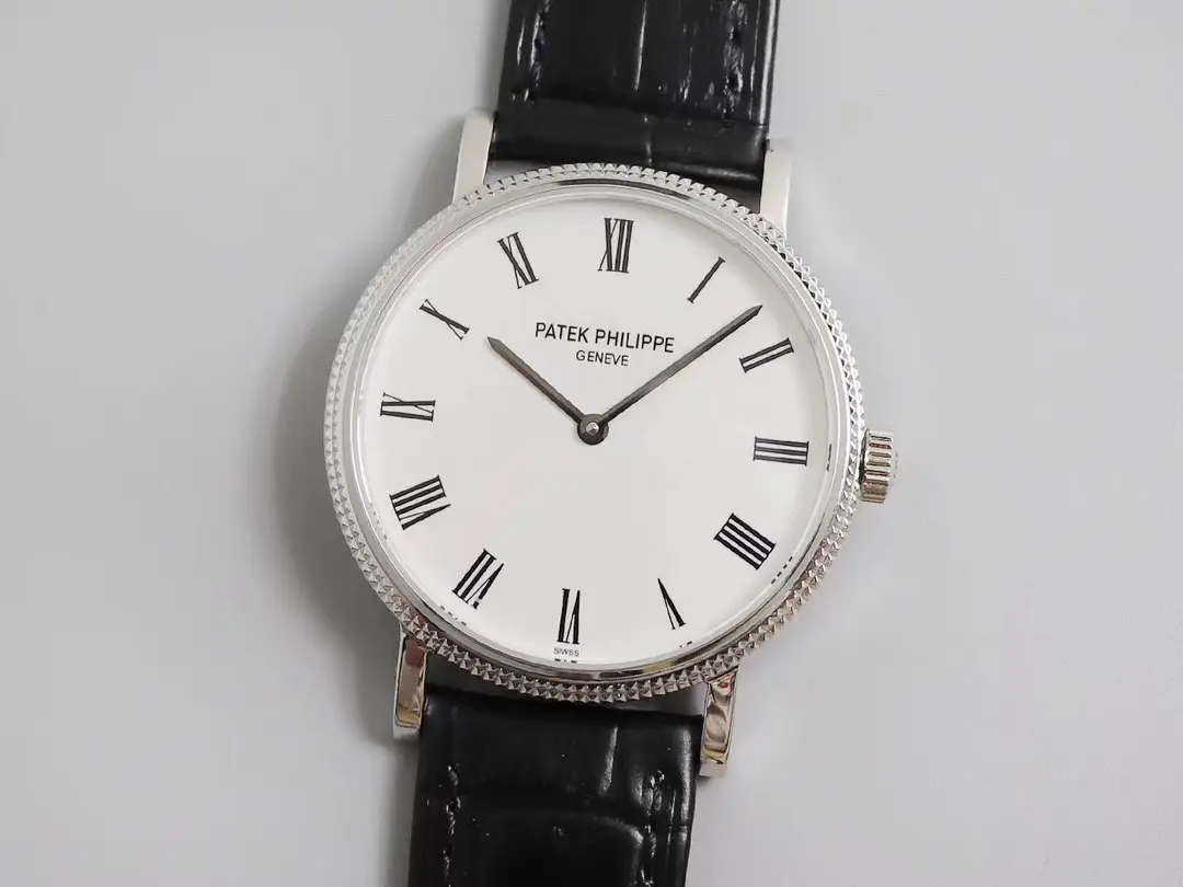 The watch is enhanced by a sleek and ultra-thin look. Roman Numerals in White Dial This classic dial features white roman numerals. This watch has an elegant look. Black Leather Strap: The black leather strap on this model adds to its luxurious appearance. Calatrava Series: This watch is part of Patek Philippe’s Calatrava Series which is known as a series with elegance and simplicity. Bezel with Pearl Dots The pattern on the bezel is made up of tiny pearl dots. This adds an elegant and refined touch. Patek Philippe Calatrava: A timeless classic. This watch is a stunning blend of luxury and simplicity. It features a white dial and black leather strap with Roman numerals. Explore the world of exceptional craftsmanship with. Mirror such iconic designs precisely.