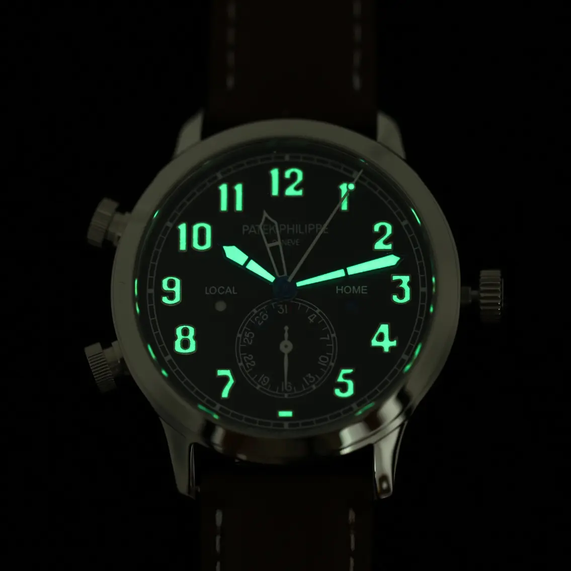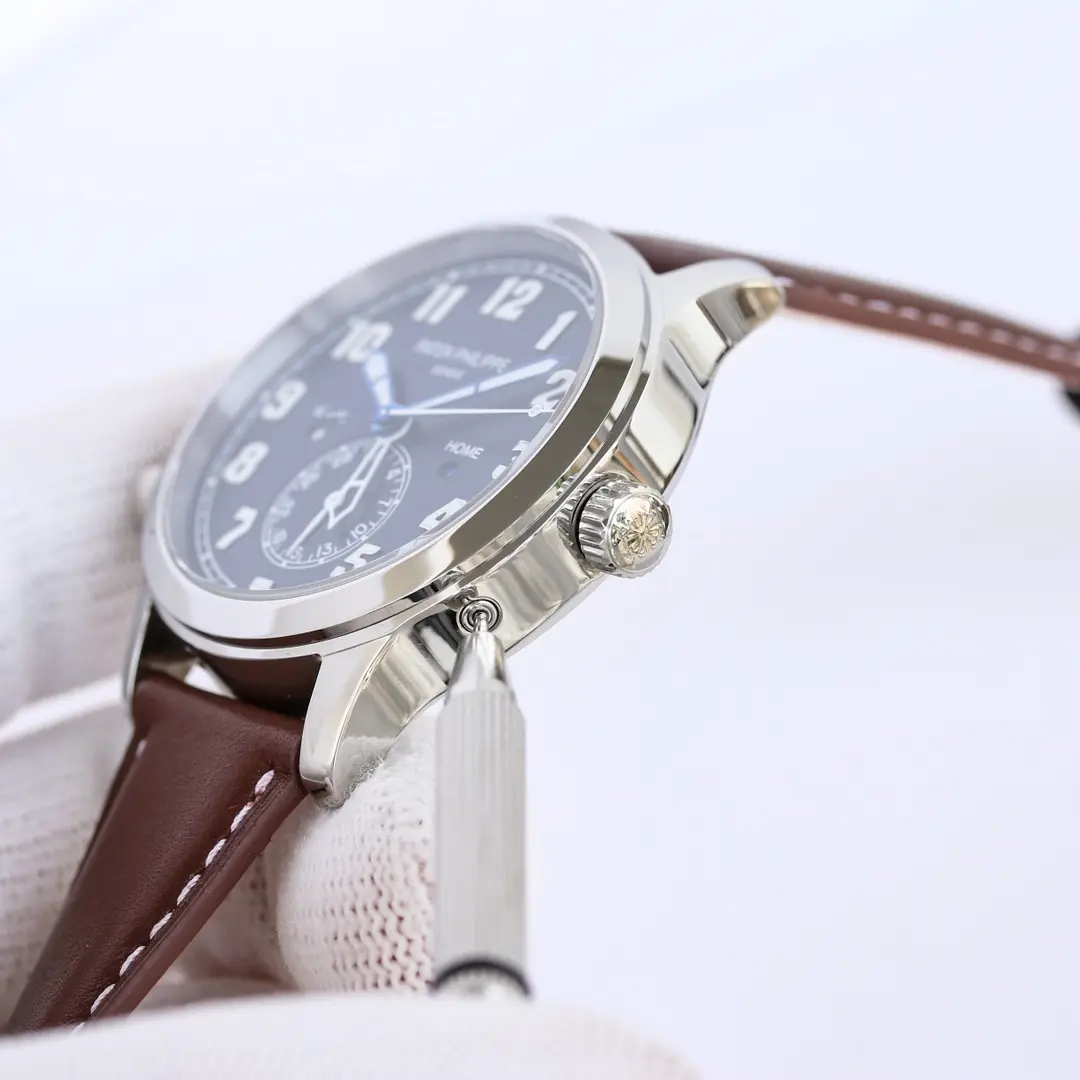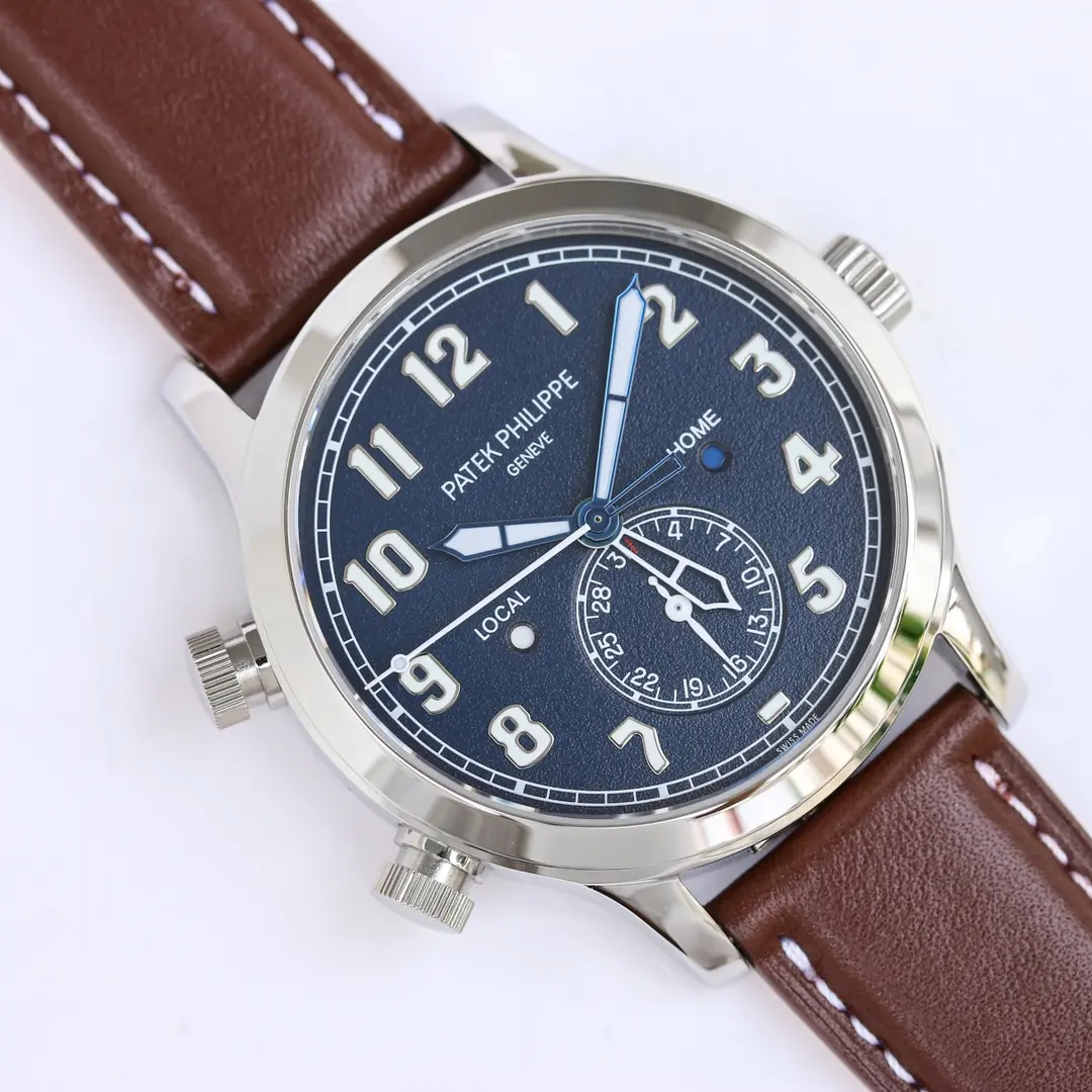The Patek Philippe Calatrava Pilot Travel Time Watch combines luxury with functionality, featuring a dual time zone display, a blue dial, and a brown leather strap. Perfect for the discerning traveler, this 42mm rose gold watch is both stylish and practical.