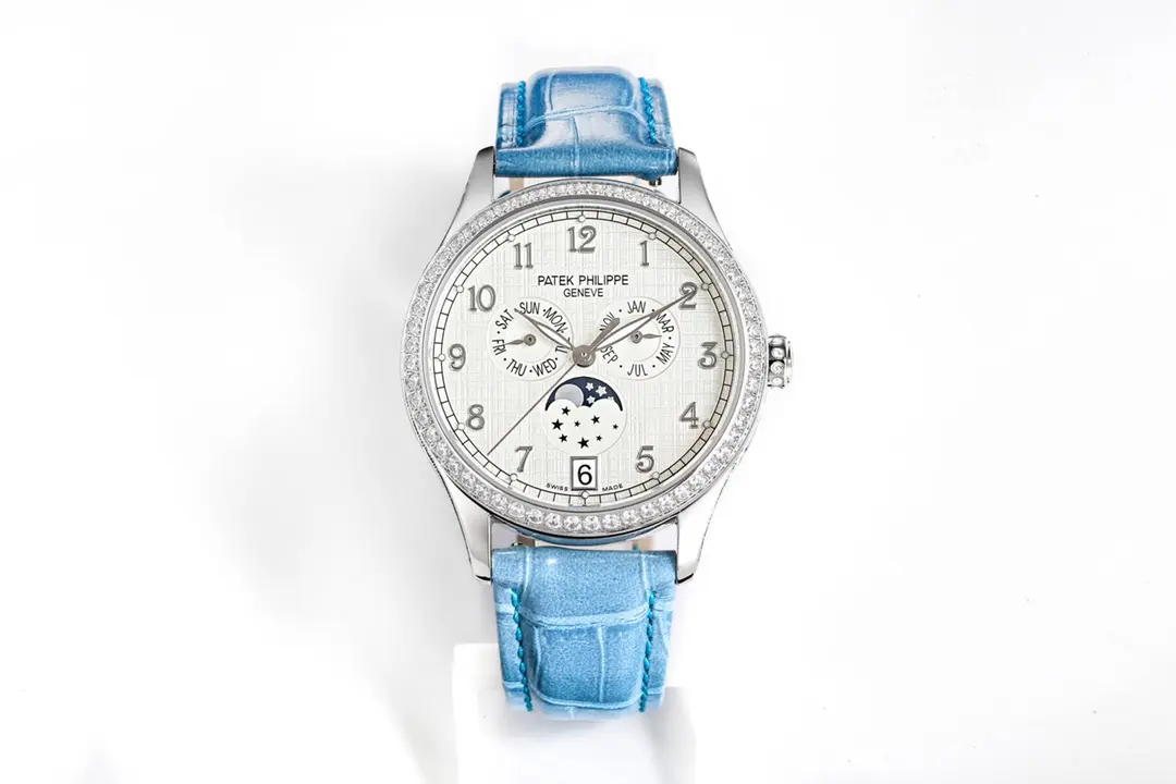 Patek Philippe Complications 4947R Blue Leather Watch — Premium 1:1 super clone. Case: 904L stainless steel or 18k gold case. Crystal: Genuine sapphire crystal with AR coating. Movement: Clone Patek caliber (mechanical automatic). 12-month movement warranty. Free worldwide shipping on orders over $1,200.