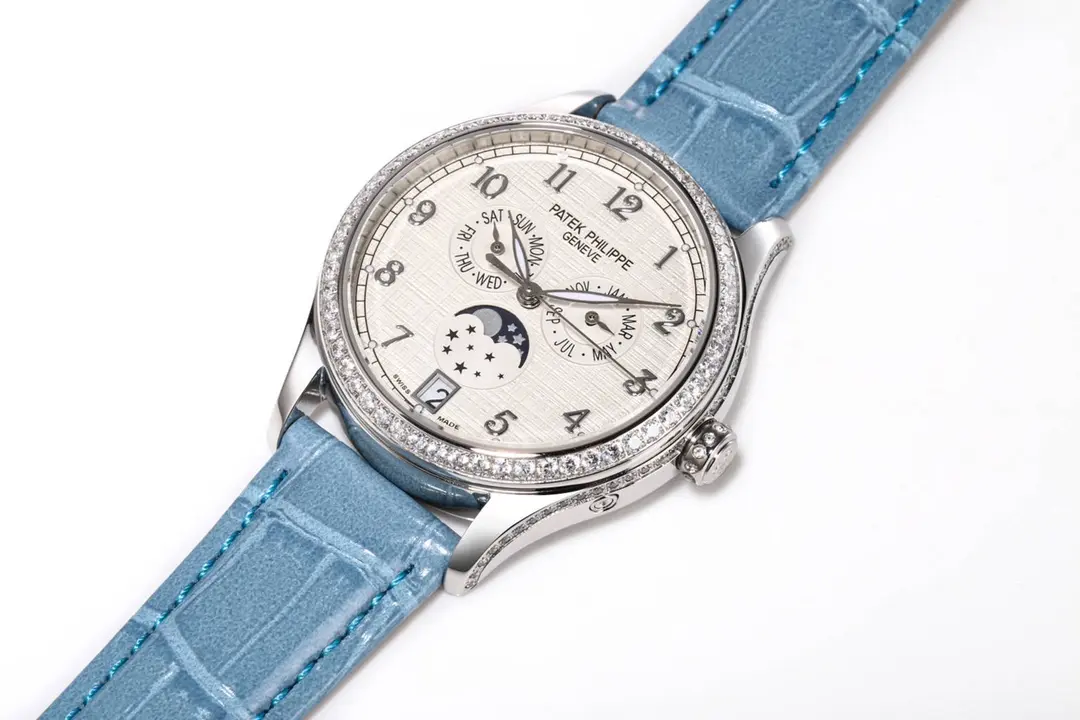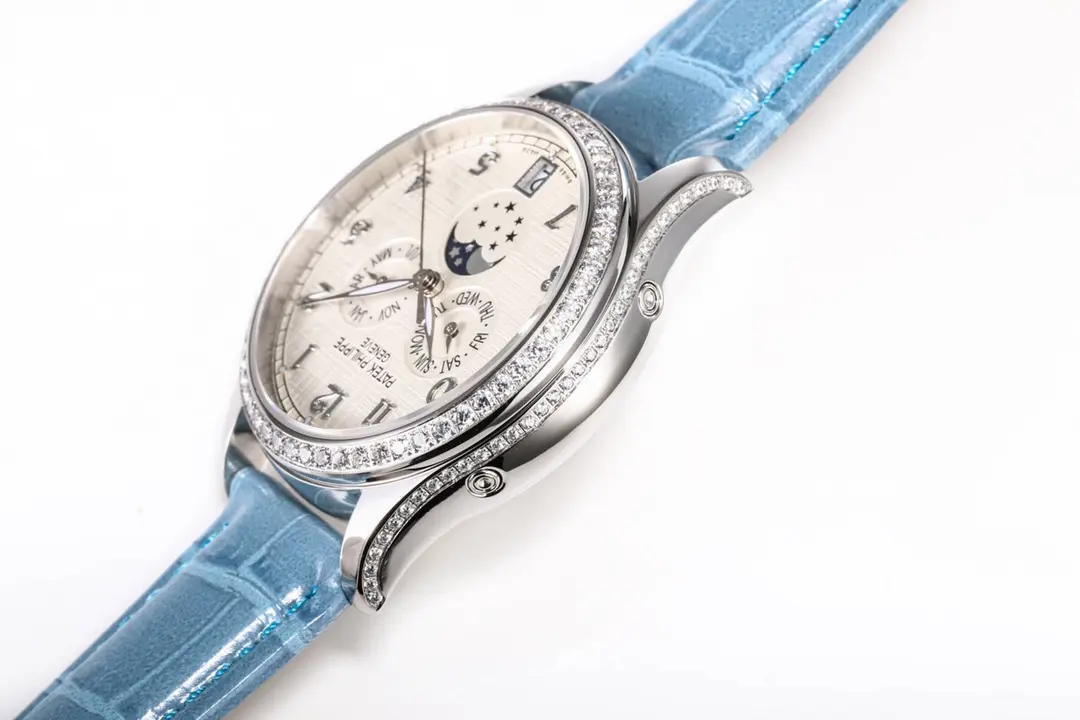 - Moon Phase and Annual Calendar: This watch combines a practical moon phase display with a functional annual calendar. It only requires one adjustment per annum. Diamond Case: This watch is decorated with diamonds to enhance its luxury appearance. The dial is made of mother-of-pearl with applied Arabic numerals in gold tone. This allows for easy time reading. Sub-Dials include sub-dials at 9, 3, and 6 o’clock for the day, date, and month. Also included is the display of the lunar phase. Italian Leather Strap: Includes a blue hand-stitched Italian-leather strap, which is complemented with an original diamond-set pin buckle. Patek Philippe’s women’s watch features an annual calendar, moon phase, and a diamond-set case. It is both elegant and functional. Explore the exceptional craftsmanship of Patek Philippe with designs akin to.