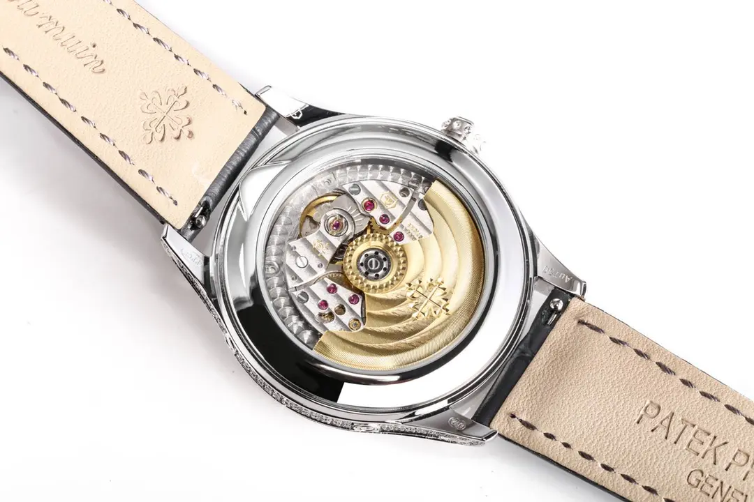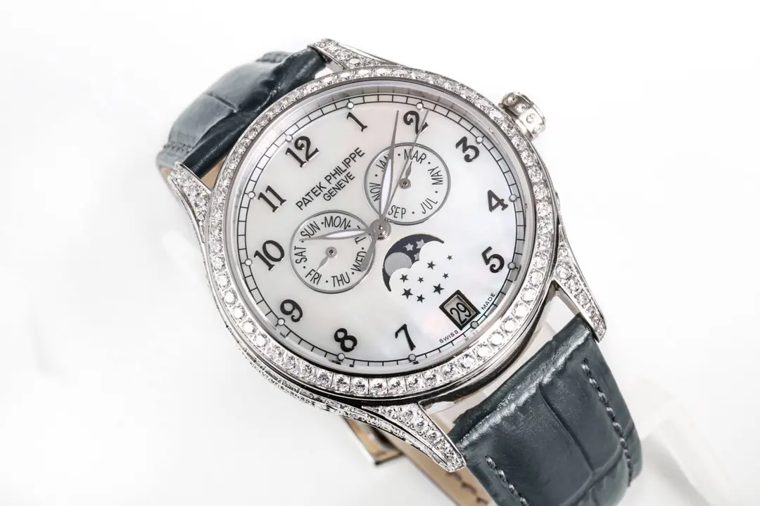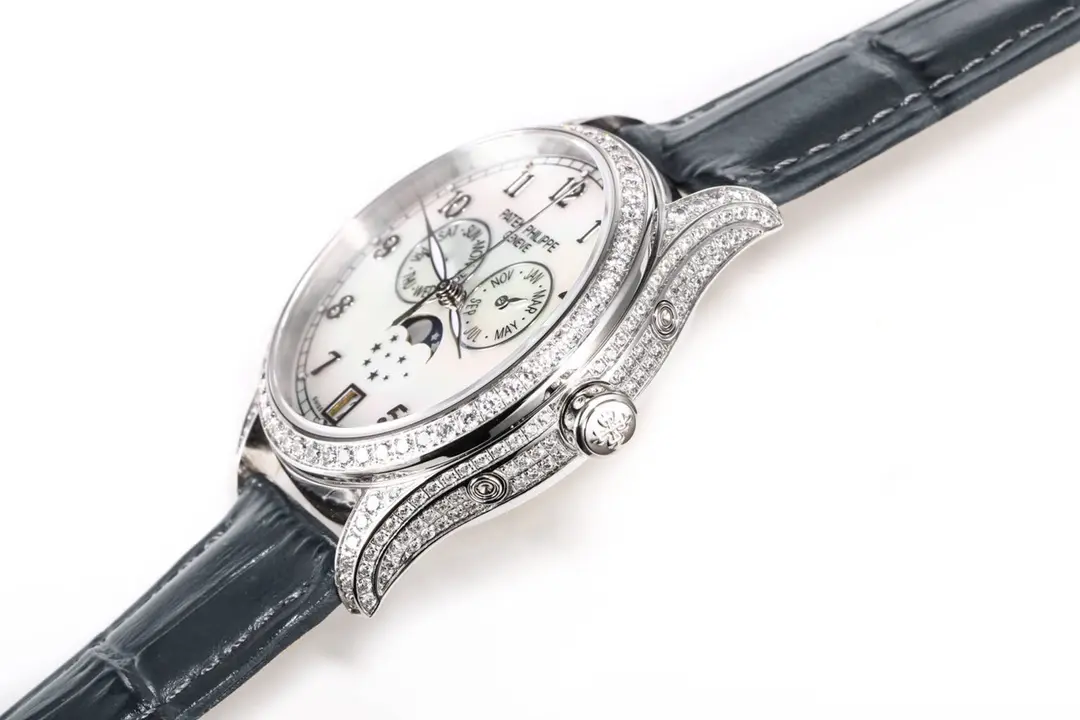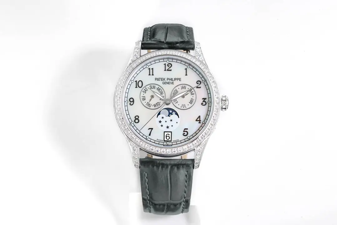 Patek Philippe Complications 4947R White Dial Leather Watch — Premium 1:1 super clone. Case: 904L stainless steel or 18k gold case. Crystal: Genuine sapphire crystal with AR coating. Movement: Clone Patek caliber (mechanical automatic). 12-month movement warranty. Free worldwide shipping on orders over $1,200.