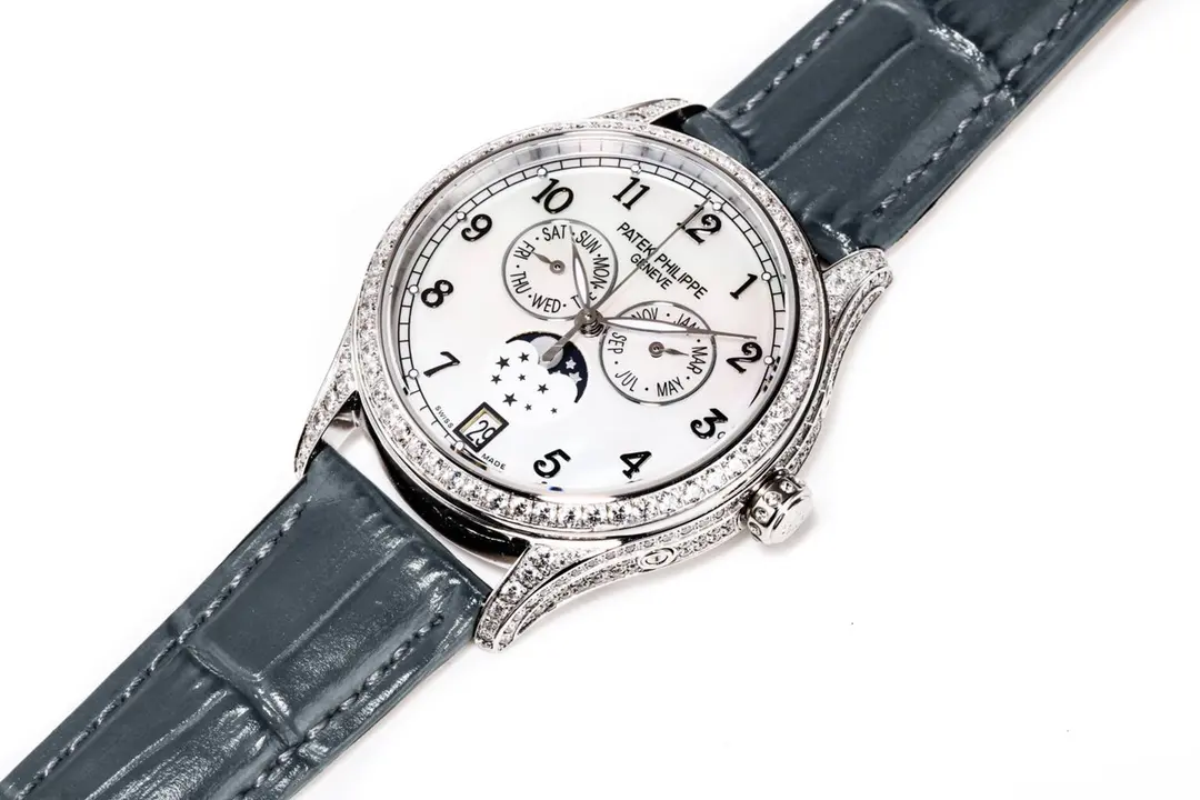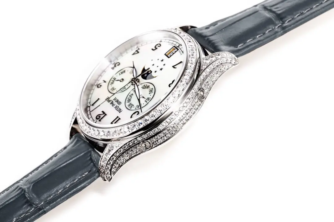 • The combination of a lunar phase and an annual calendar combines both a useful display for the phases of the moon with a functional, annual calendar. This watch only needs to be adjusted once a year. Diamond Bezel: The watch’s diamond bezel enhances its luxurious appearance. The watch is given a polished look to enhance its sophisticated appeal. The watch has smooth lines and curves. The dial is made from mother-of-pearl with Arabic numerals in gold, and gold hands. It also has gold Arabic numbers applied to the face. The day, the month and the date are displayed at 9 o’clock, 3 o’clock and 6 p.m. Moon phase is also included. Italian Leather Strap: This leather strap is made from Italian leather and features an original pin buckle with diamonds. Patek Philippe’s women’s watch features both a lunar calendar and an annual calendar set in a diamond bezel. The dial is made from mother-of-pearl. The Italian leather strap makes this watch stand out among others. Discover more about to explore similar luxurious designs.