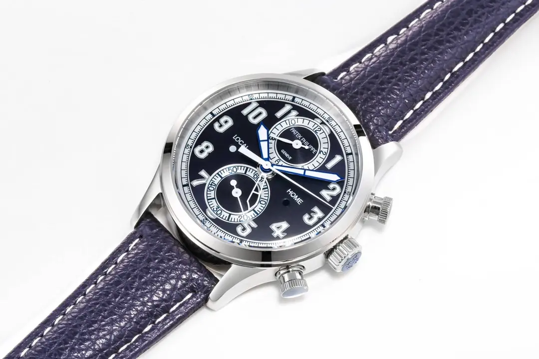 Patek Philippe Complications 5924G Blue Leather — Premium 1:1 super clone. Case: 904L stainless steel or 18k gold case. Crystal: Genuine sapphire crystal with AR coating. Movement: Clone Patek caliber (mechanical automatic). 12-month movement warranty. Free worldwide shipping on orders over $1,200.