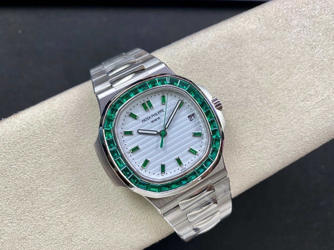 Patek Philippe Nautilus 5711 diamond-studded true-color gem emerald T square diamond ring mouth and dial scale is a high-quality 1:1 Superclone watch that is made to a very high standard. It is made with genuine materials. including a 904L stainless steel case and a sapphire crystal. The watch is powered by a Swiss ETA 2824-2 automatic movement. which is accurate and reliable.
