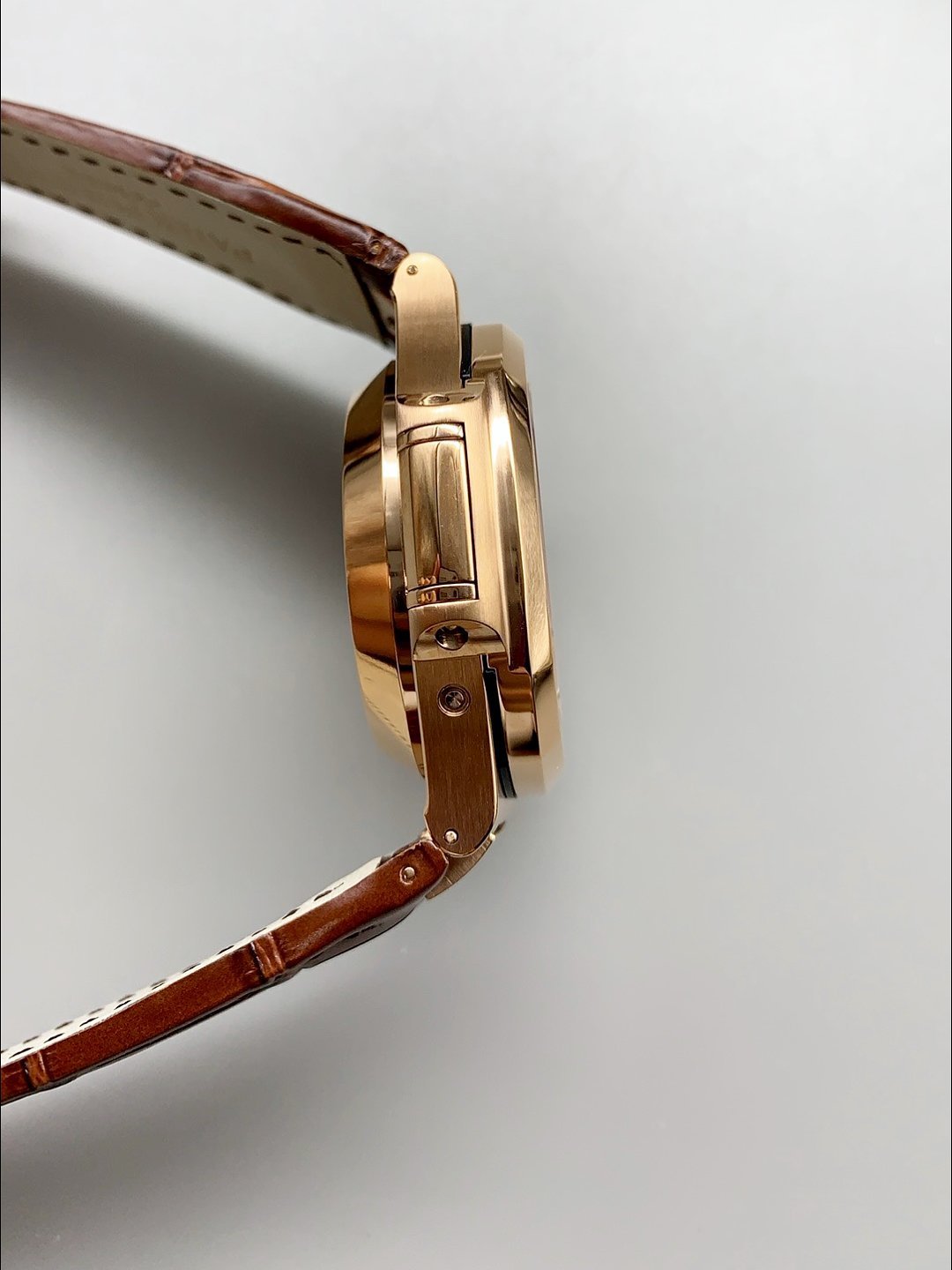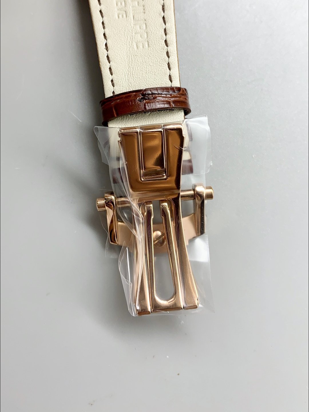 Genuine Leather Strap in Brown with Double Fold Rose Gold Plated Stainless Steel Clasps with Patek Philippe Markings/Engravings