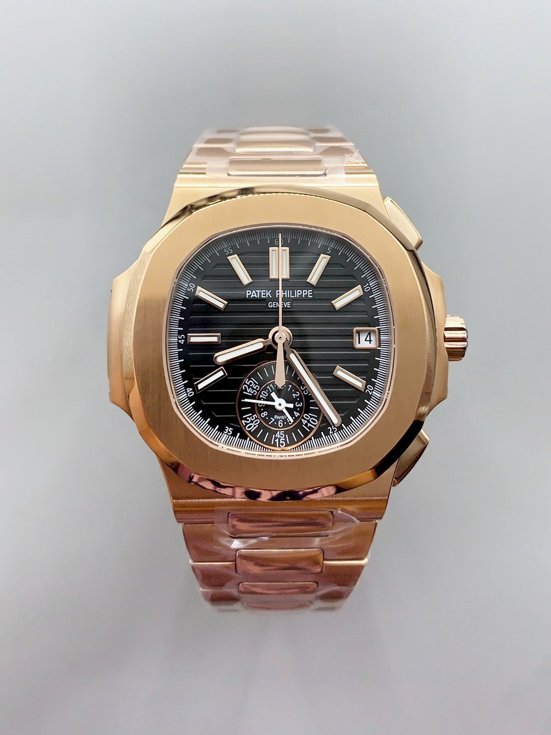 18K Rose Gold Plating on 904L Stainless Steel Case with Patek Philippe Markings and Engravings on Case Back