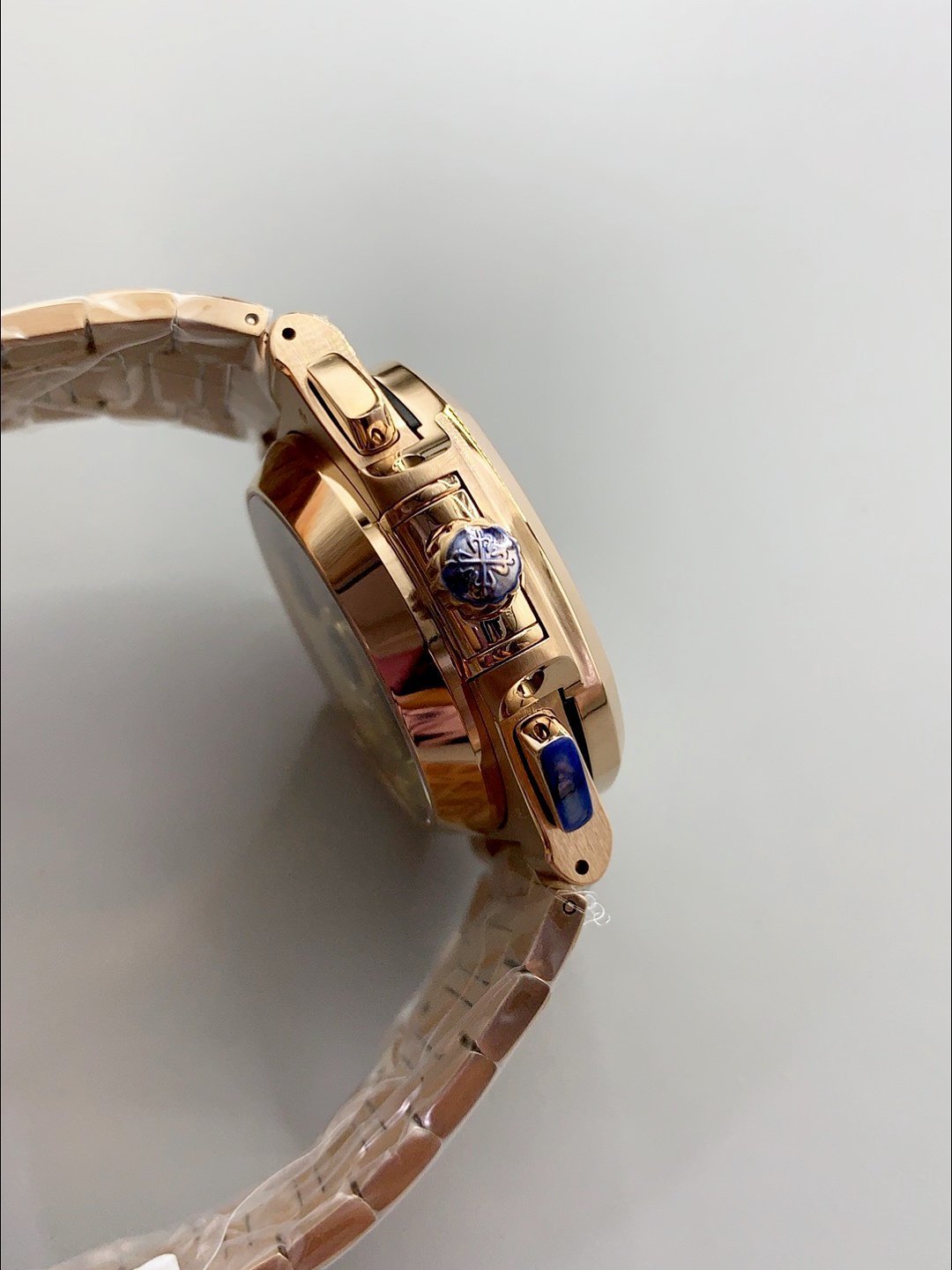 18K Rose Gold Plating on 904L Stainless Steel Strap linked with Screws with Double Fold Stainlless Steel Clasps with Patek Philippe Markings/Engravings
