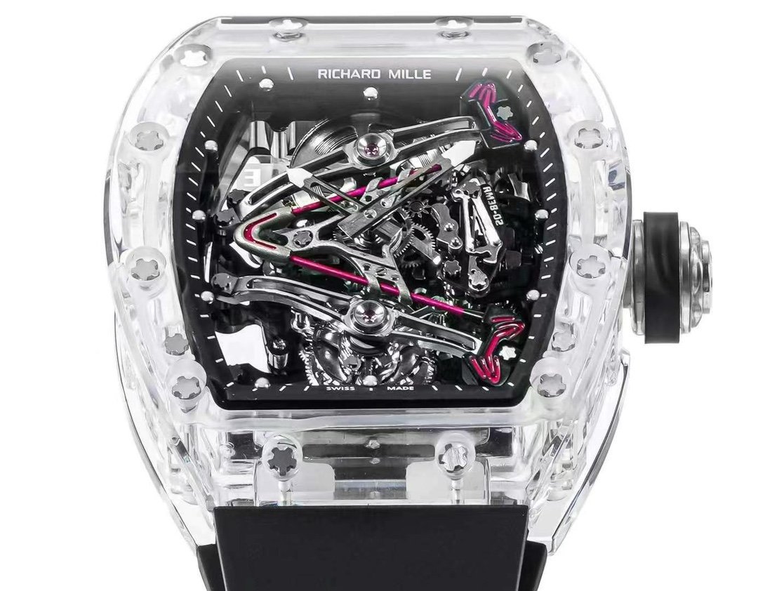 Replica Richard Mille RM 38-02 Pink Themed Crystal Skeleton Tourbillon Black Rubber Strap Watch — Premium 1:1 super clone. Case: Titanium / carbon composite tonneau case. Crystal: Genuine sapphire crystal front and back. Movement: Clone RM caliber (skeletonized automatic). 12-month movement warranty. Free worldwide shipping on orders over $1,200.