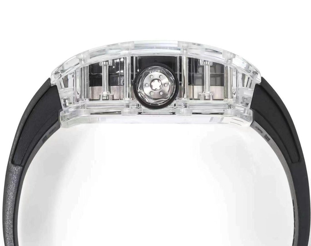 Crystal Hollow Richard Mille RM 38-02 Tourbillon Watch. The size of 41mm x 50mm, the transparent crystal case, can admire the complex movement inside 360 degrees. The hollow bridge on the dial has a pink “V” shape, which was inspired by Bubba Watson’s golf club head. This watch is equipped with a black rubber strap, sapphire glass and 50 meters of water resistance. This watch perfectly combines design and technology