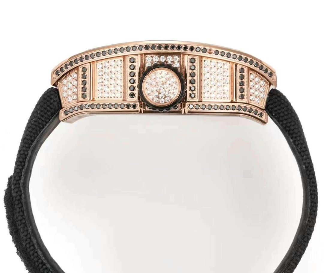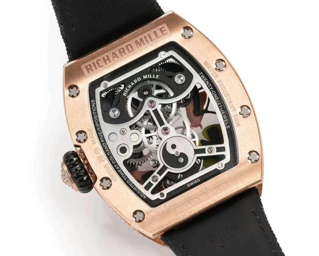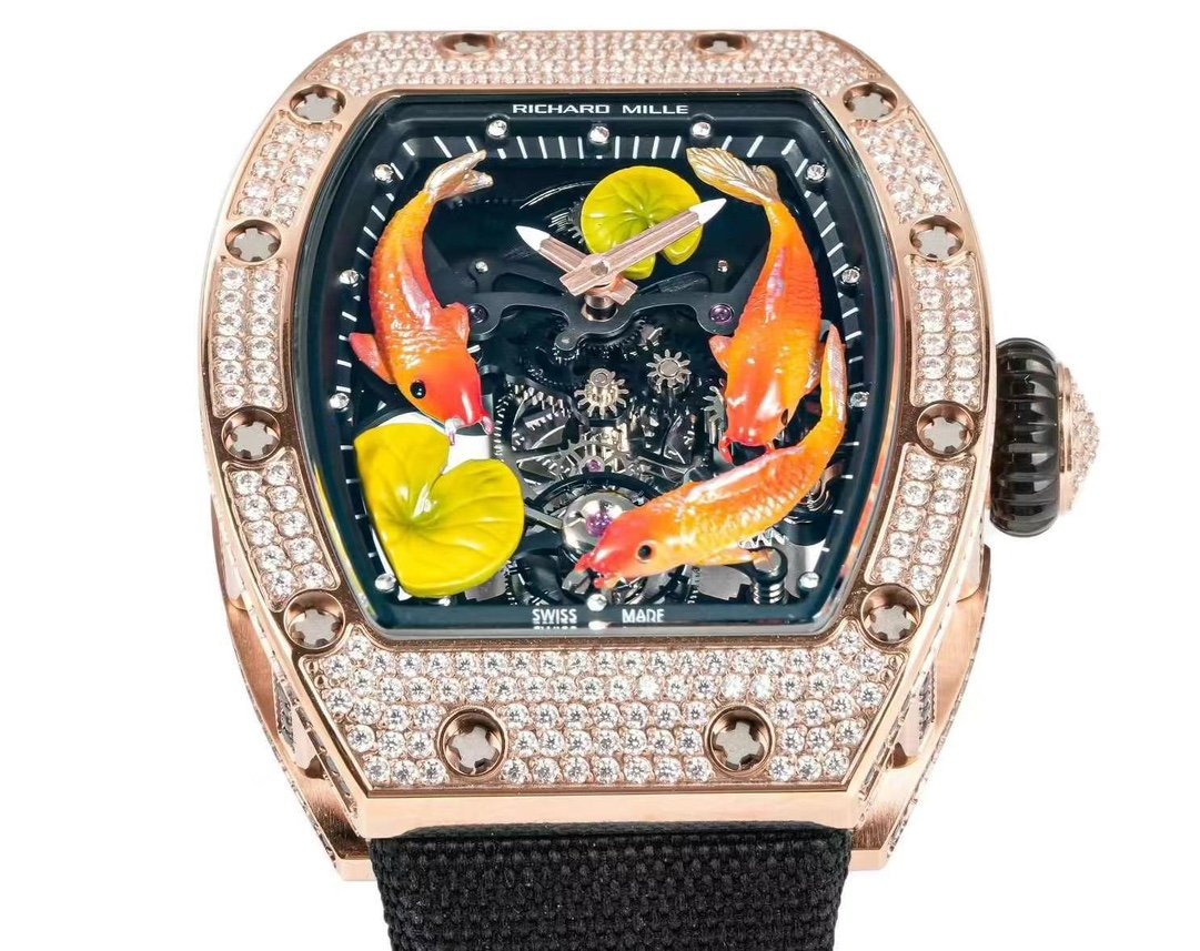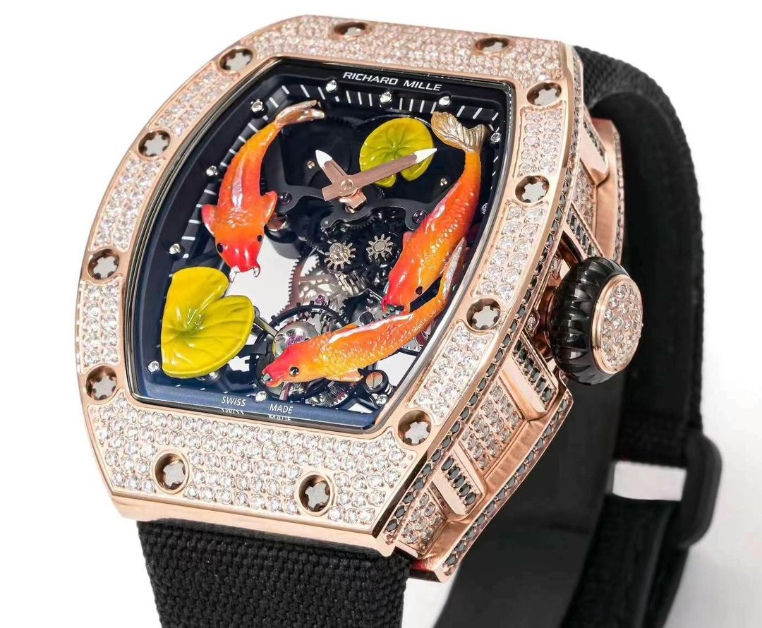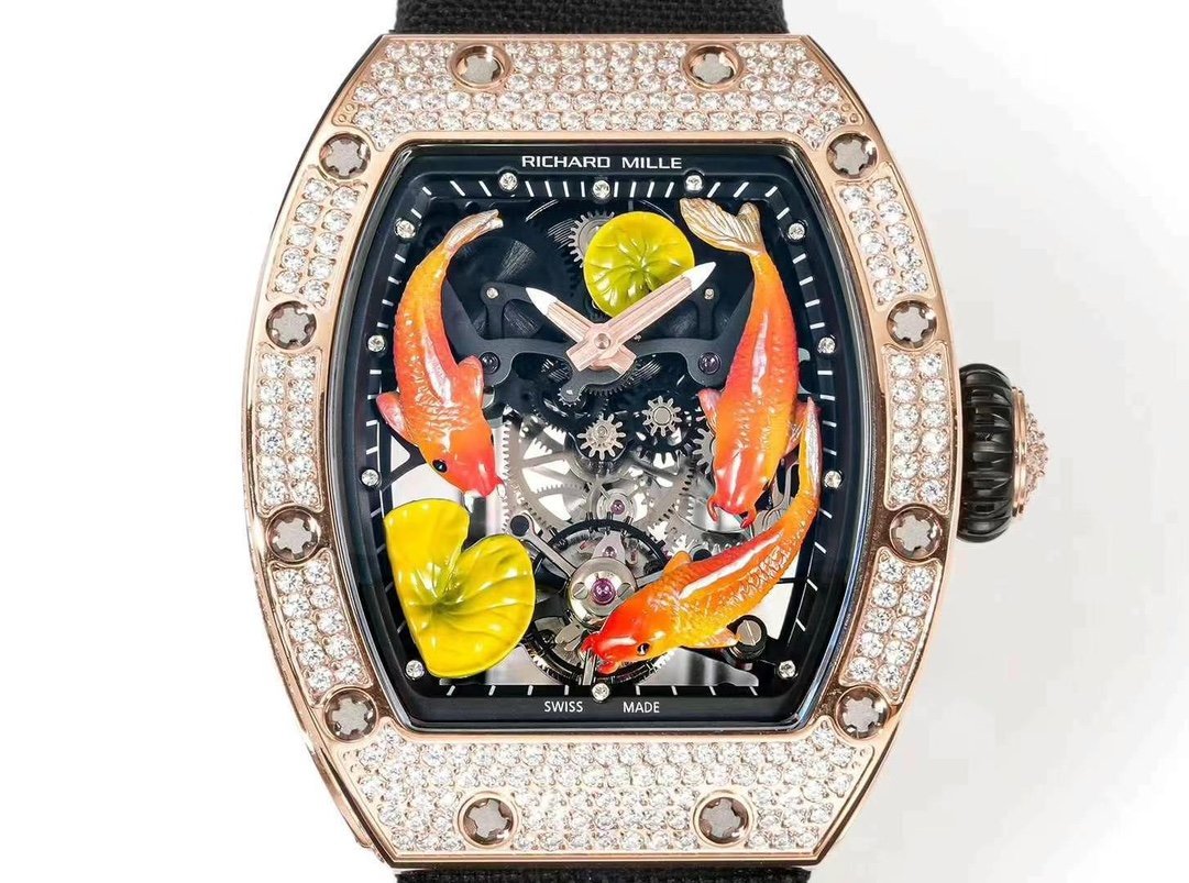 Replica Richard Mille RM S10 Koi Tourbillon Watch – Rose Gold & Diamond — Premium 1:1 super clone. Case: Titanium / carbon composite tonneau case. Crystal: Genuine sapphire crystal front and back. Movement: Clone RM caliber (skeletonized automatic). 12-month movement warranty. Free worldwide shipping on orders over $1,200.